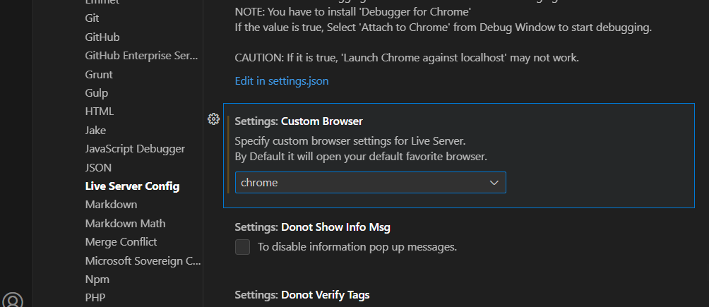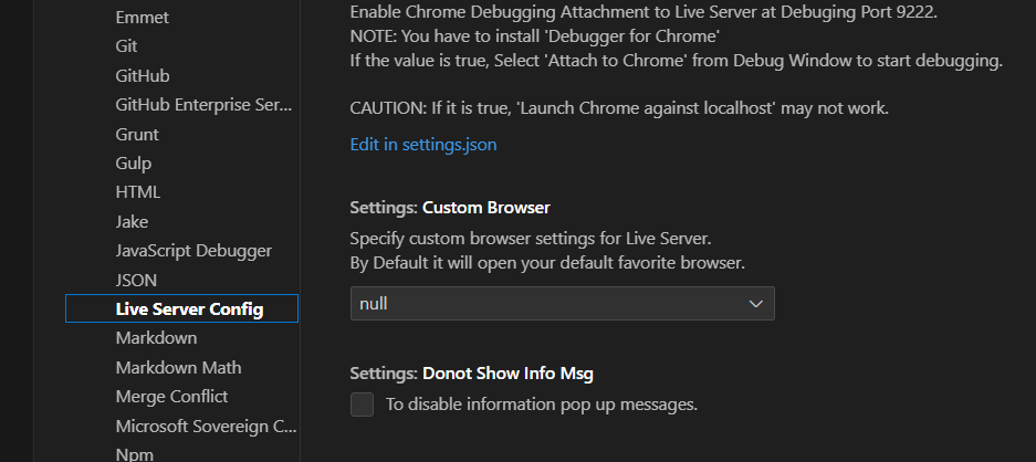 manage > settings > extensions > live server config > custom browser > chrome 변경