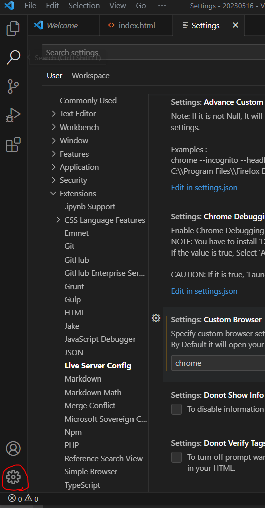 manage > settings > extensions > live server config > custom browser > chrome 변경