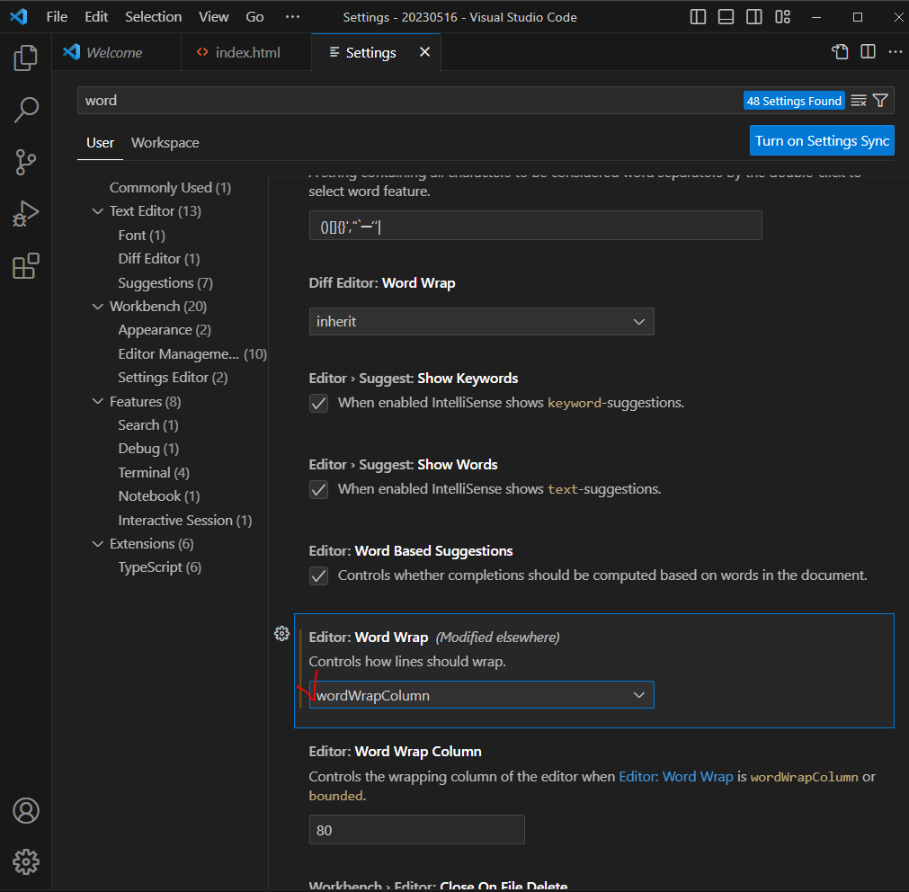 manage > settings > search settings에서 word 검색 > word wrap 찾아서 wordwrapColumn 설정 하기