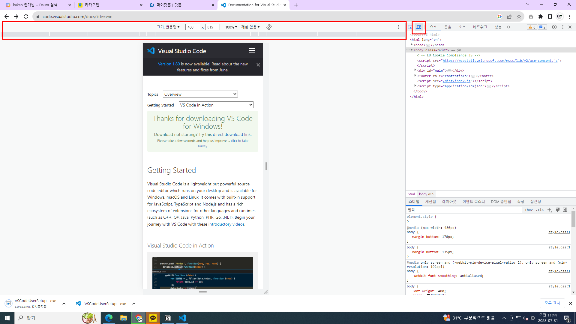 반응형 확인 시 사이트에 반응형 크기로 보는것이 좋다.
