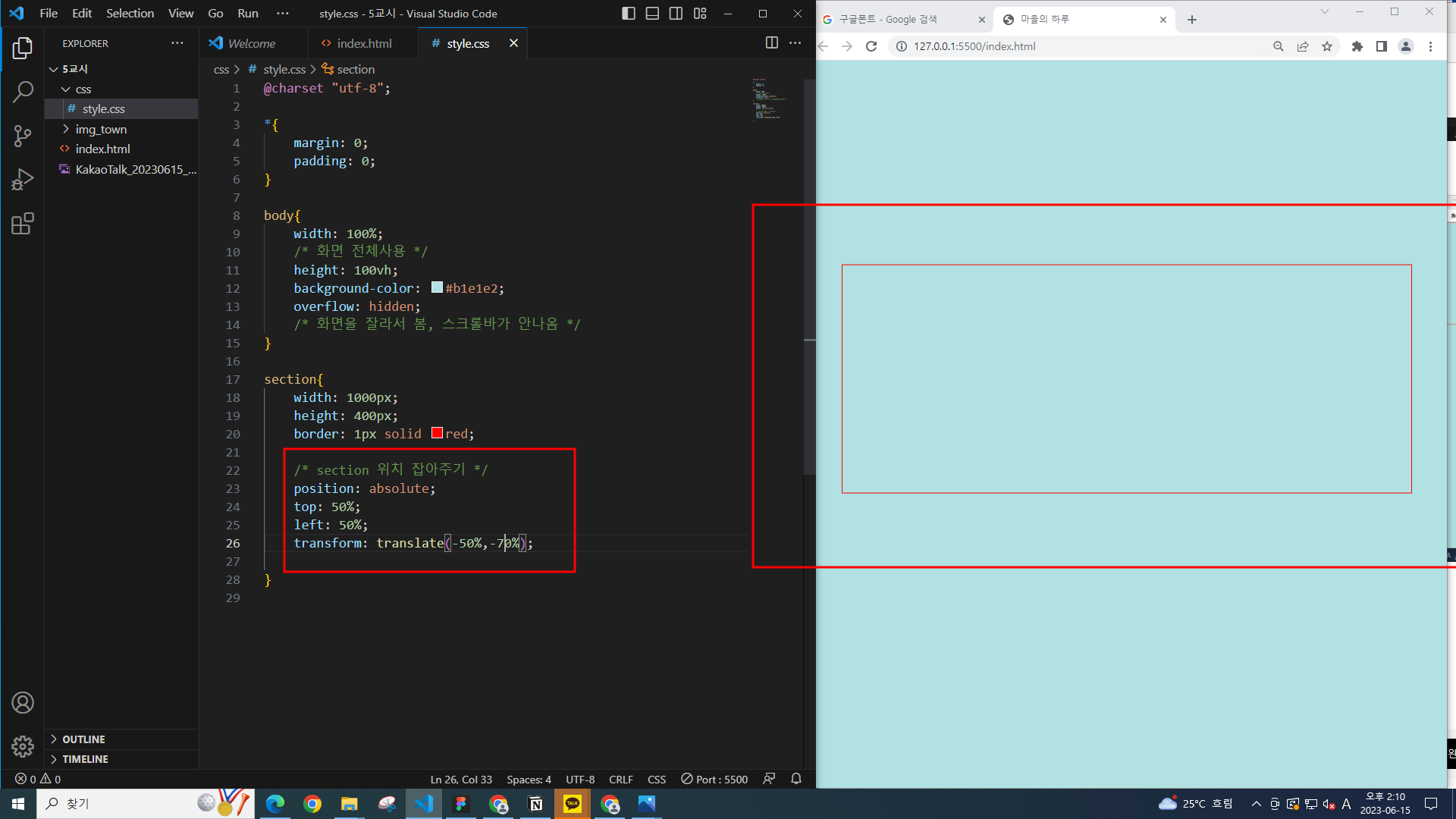 2. section 편집 : 박스를 만들어주고 section (작업할 영역)위치를 잡아준다.