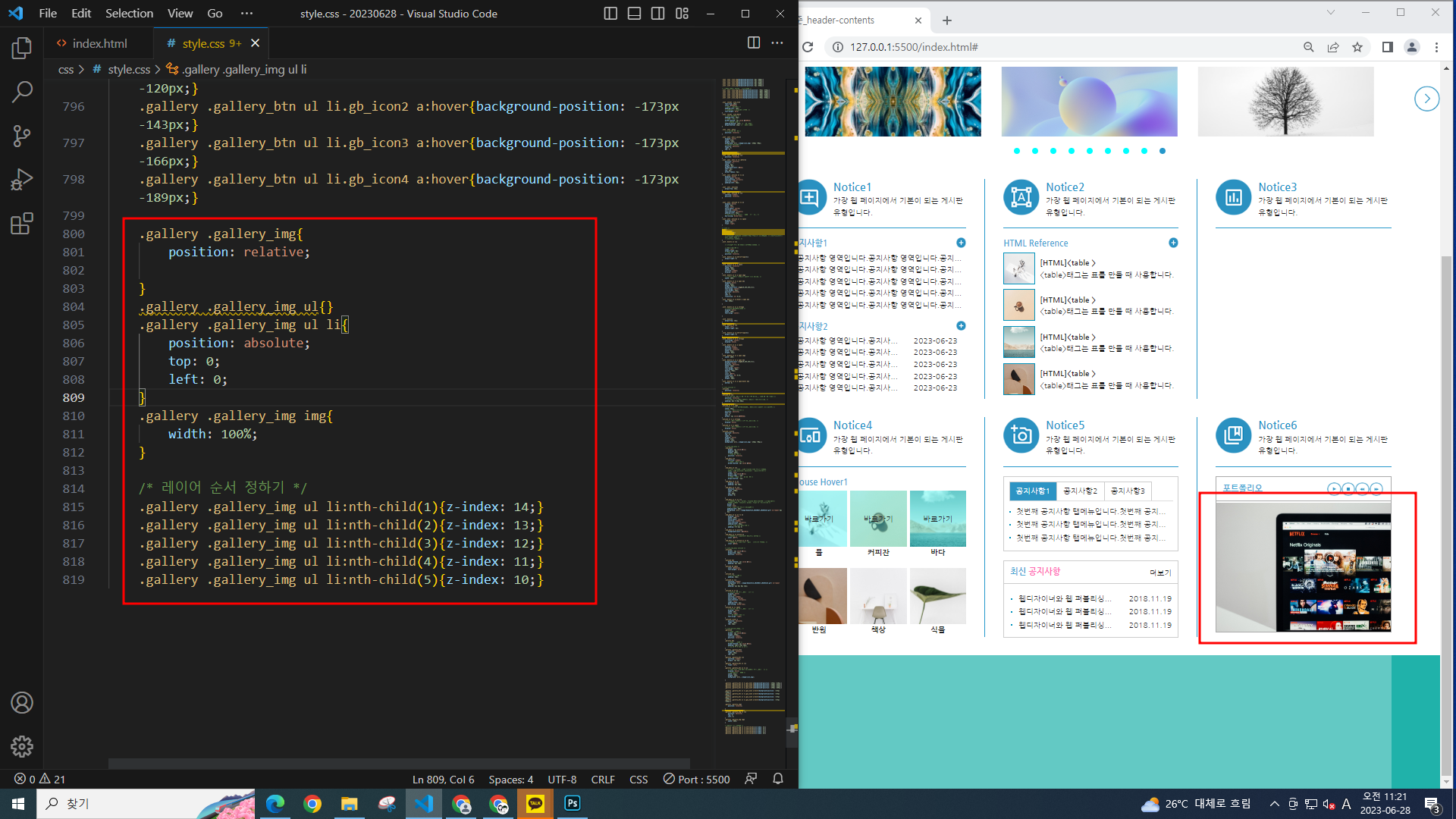 이미지 li의 레이어 순서를 정해주기 위해 position: absolute 하고 z-index로 레이어 순서를 정해준다.