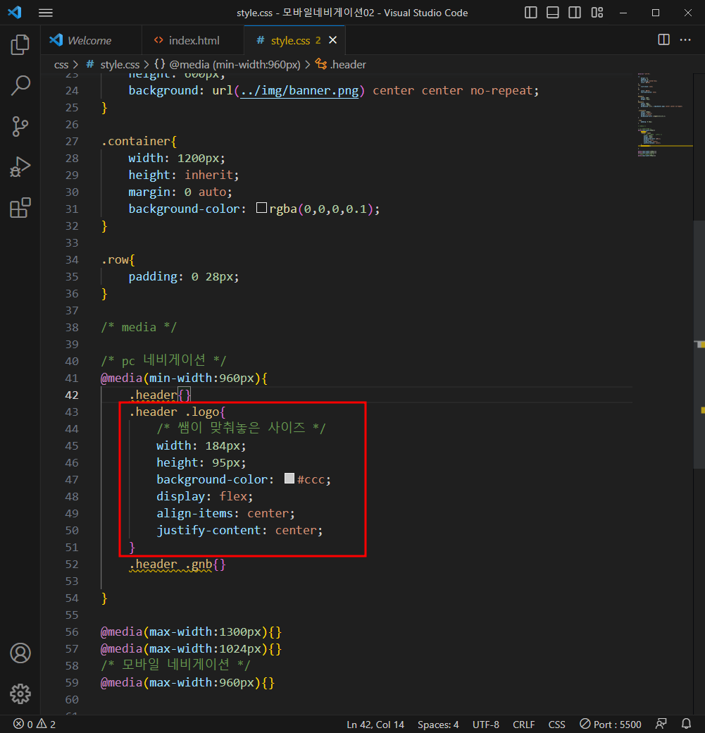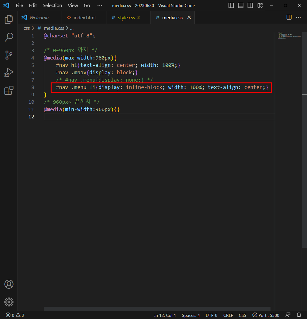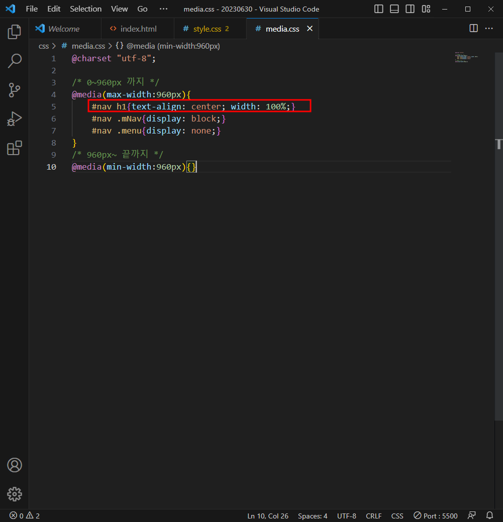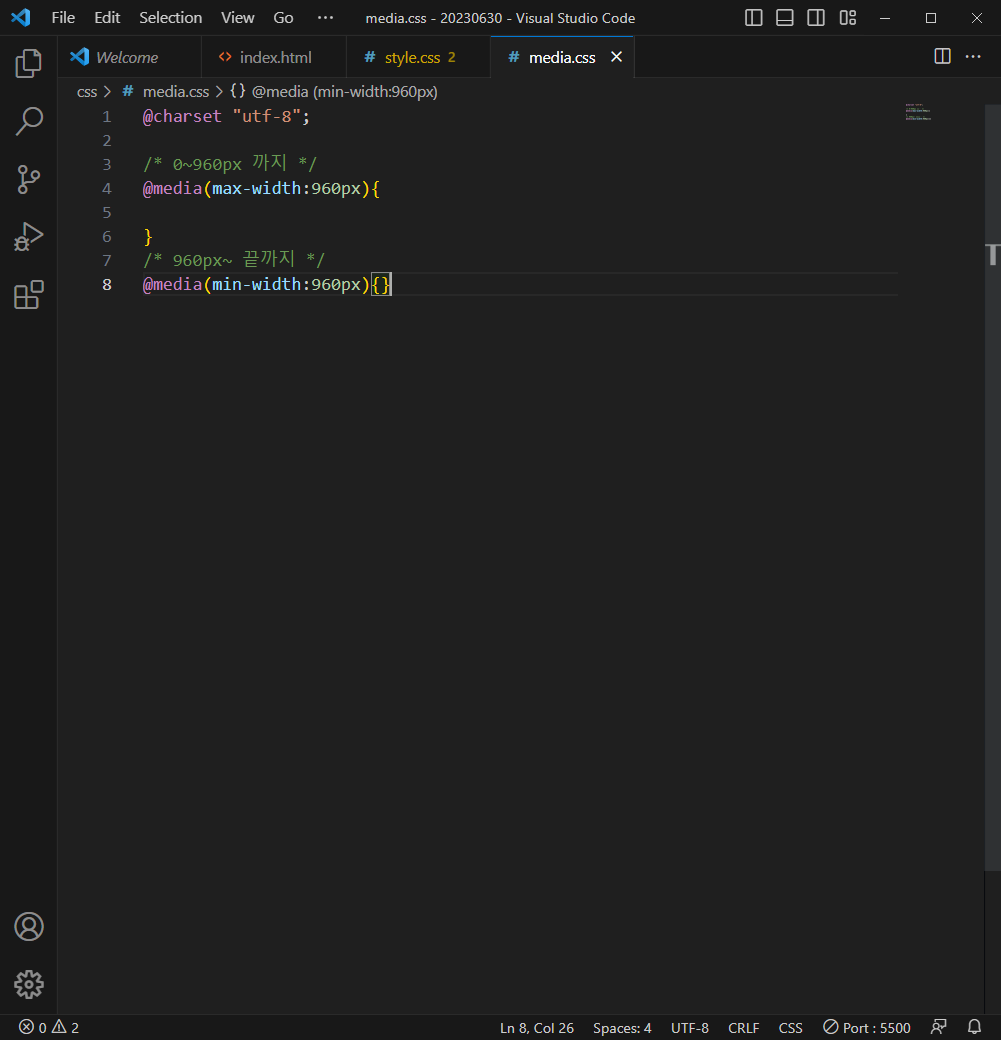 media.css 만들기 (index.html에 링크 걸기 마지막 순서로 걸어준다.)