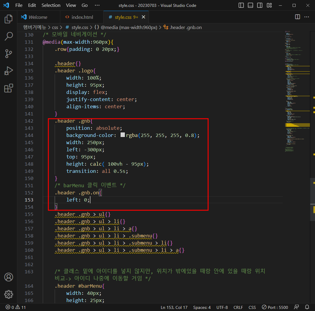 960px 이상일 때 네비게이션 슬라이드 효과 지정