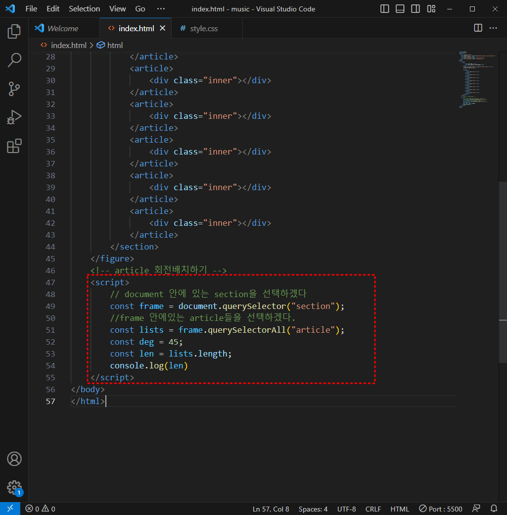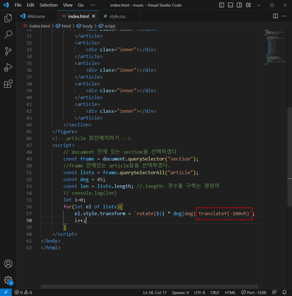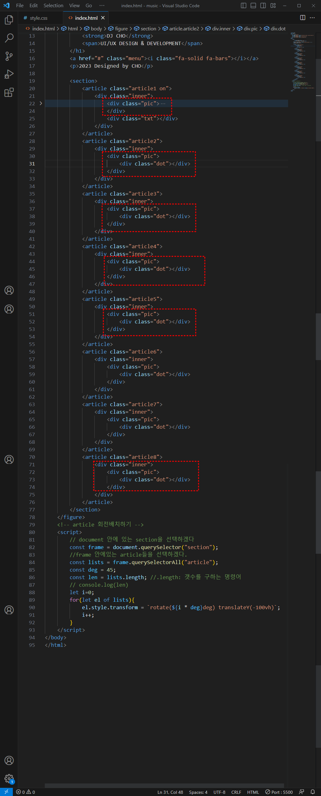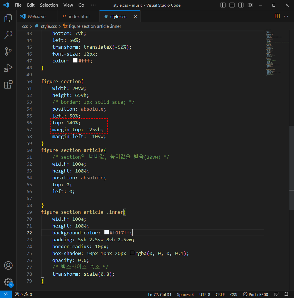 전체적으로 밑으로 내려야한다. article를 감싸고 있는 section에 기준점으로 위치를 변경시킨다.