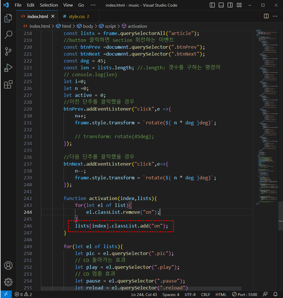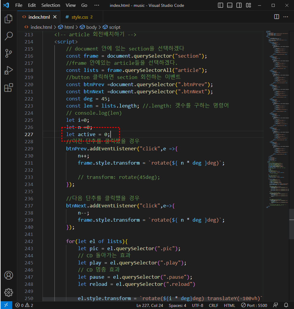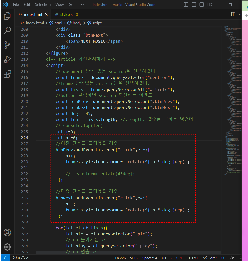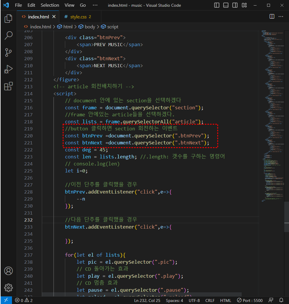 initMusic();을 복사해서 이전단추, 다음단추에 붙여넣기한다.