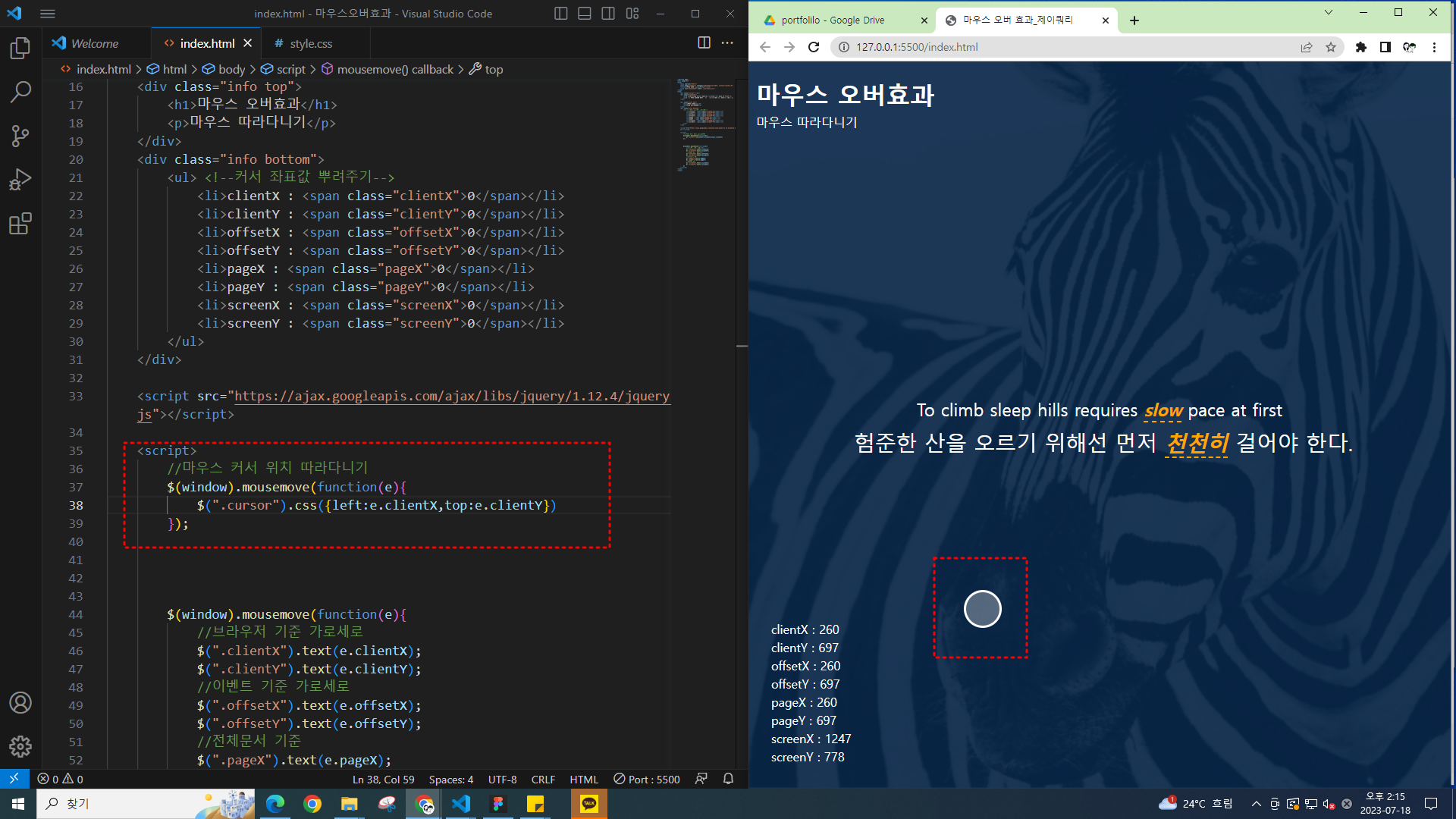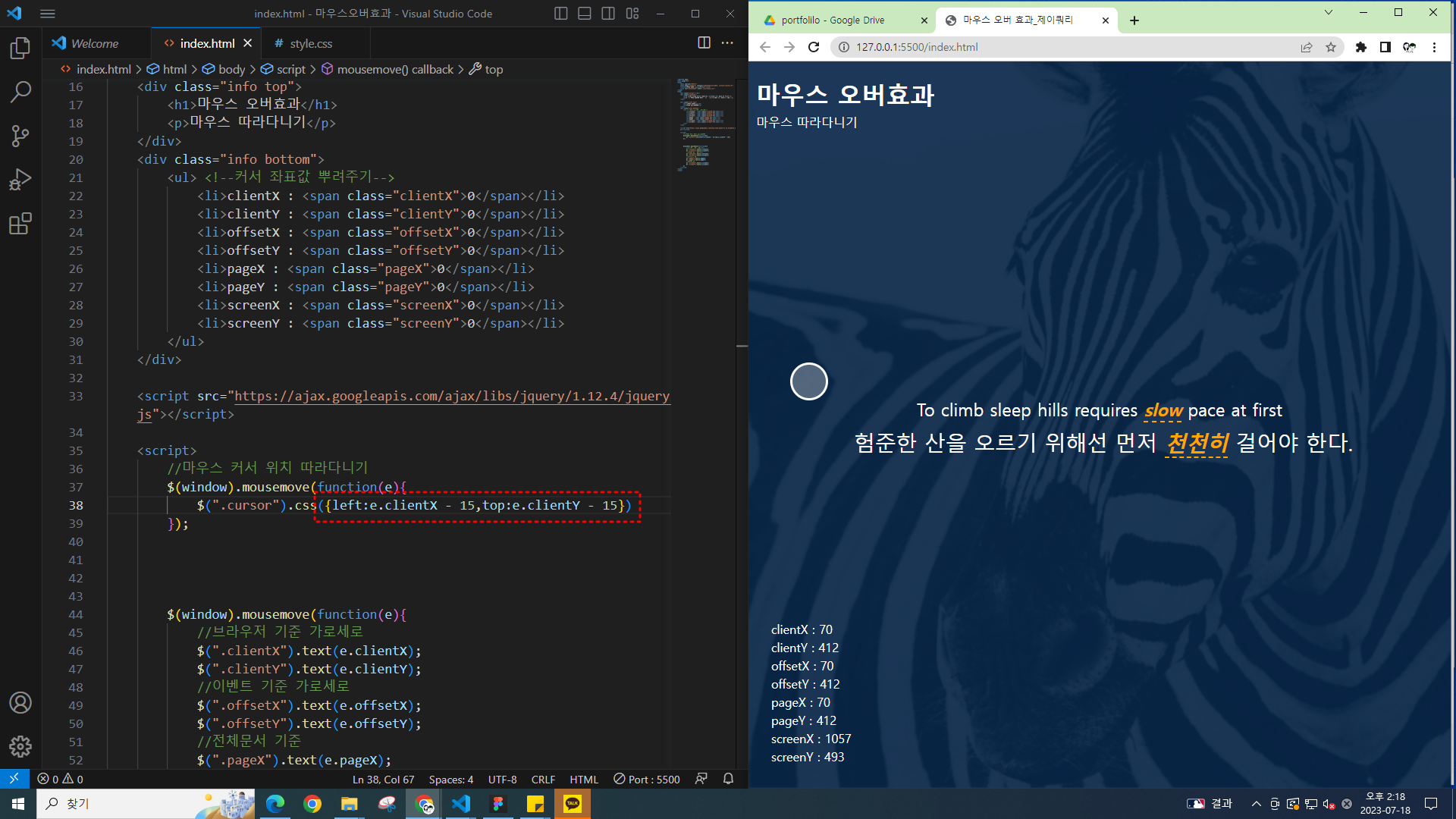 커서가 slow와 천천히를 만나면 색이 변하고 커지는 효과 주기