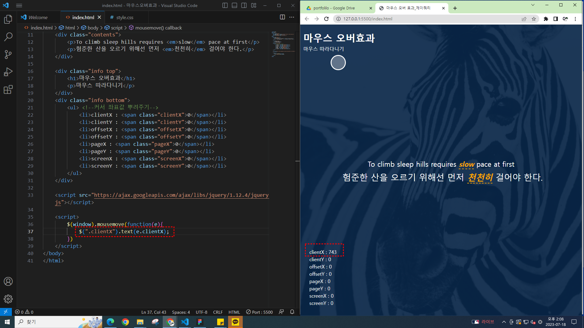 e.clientX 윈도우가 갖고있는 x 좌표값을 글자만 따서 .clientX에 넣어라
