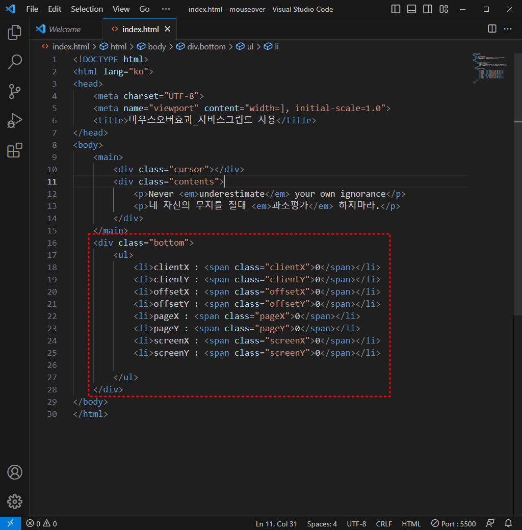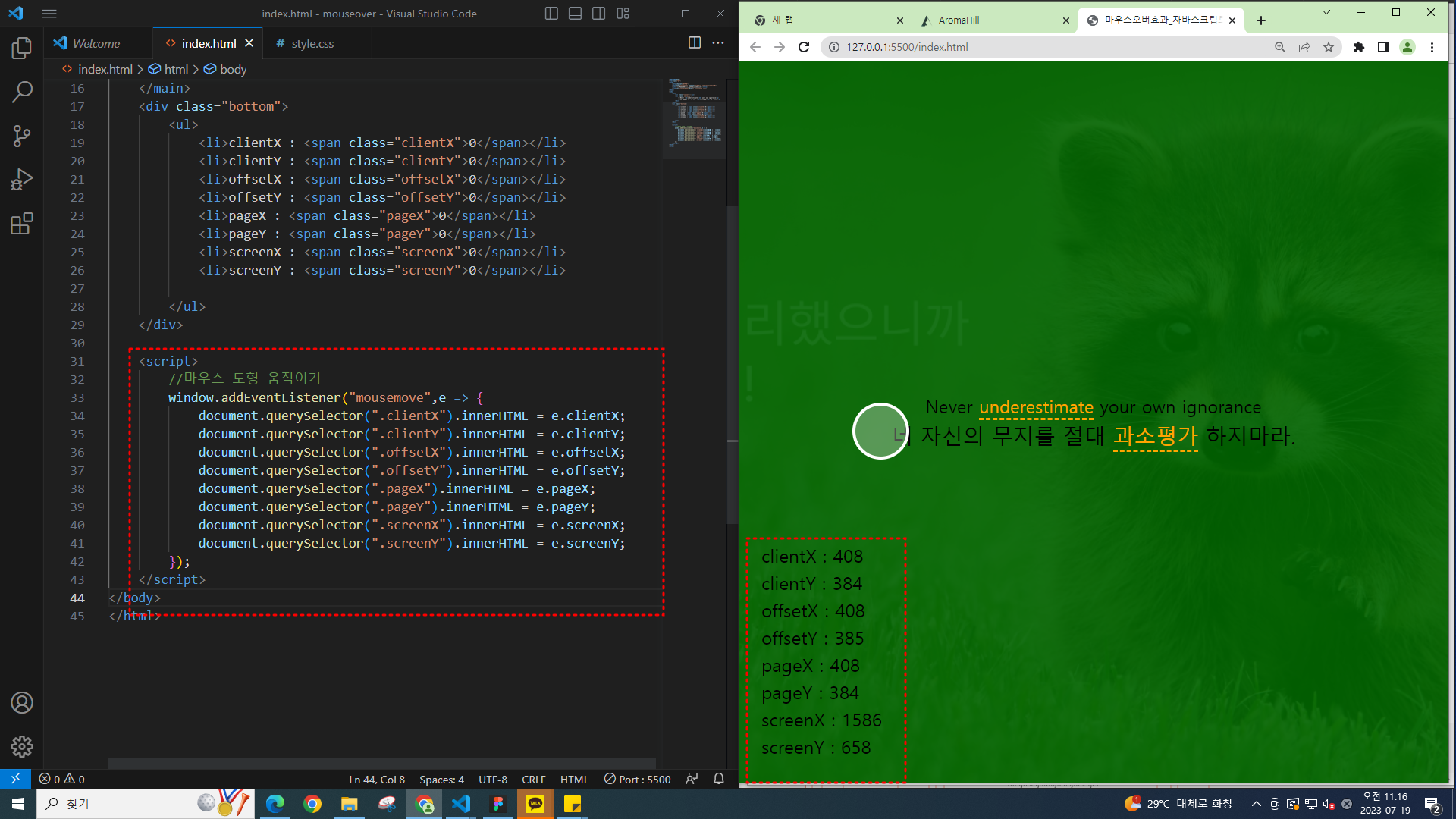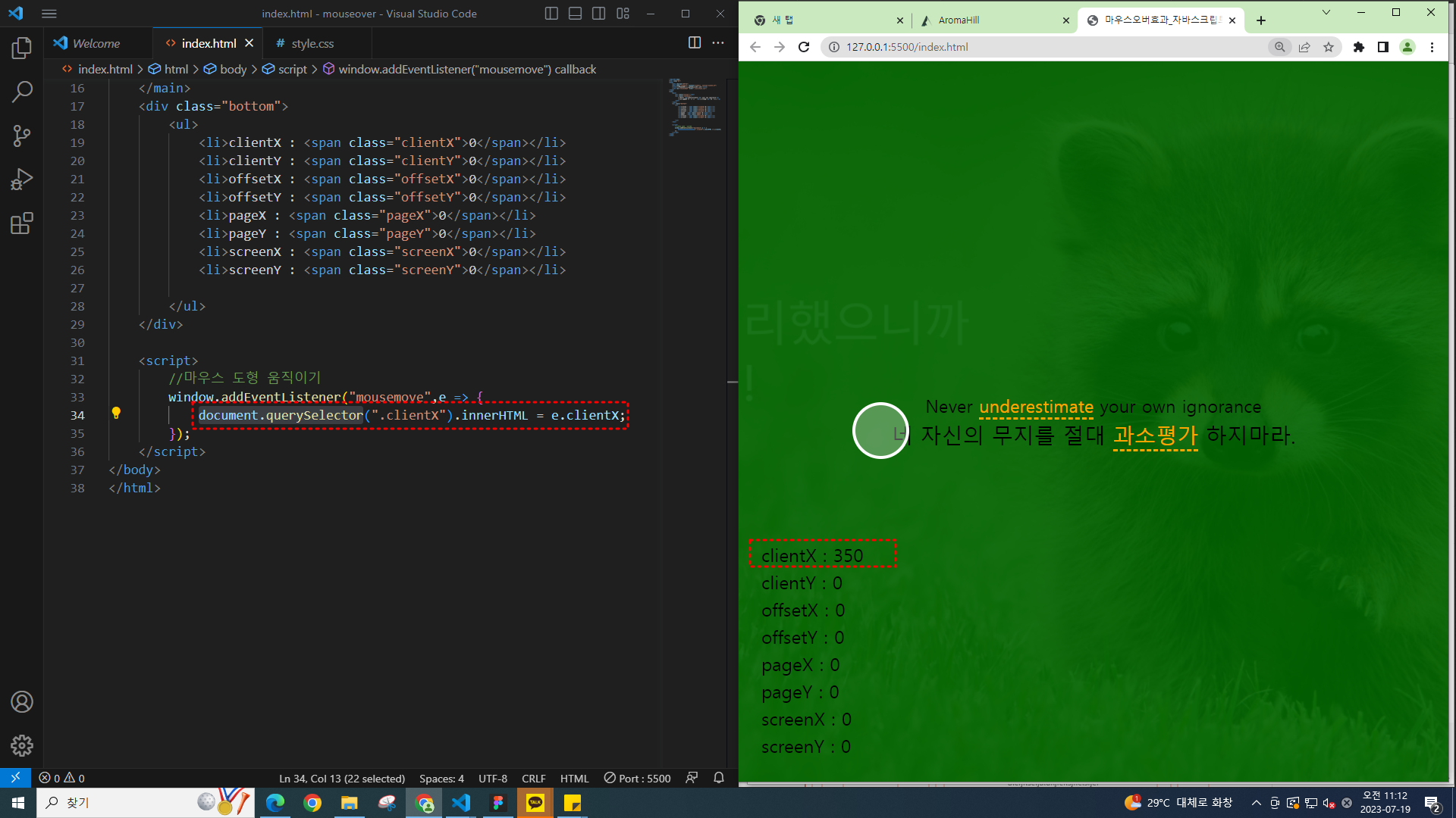 마우스를 움직였을 때 html의 x값 좌표를 출력해라.