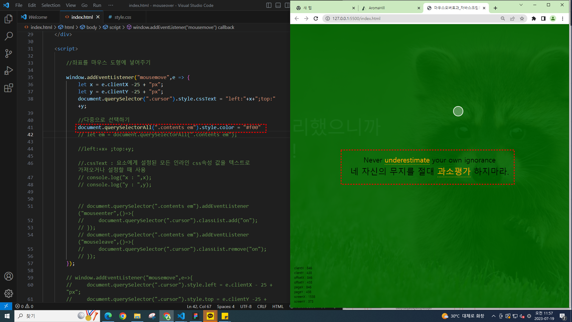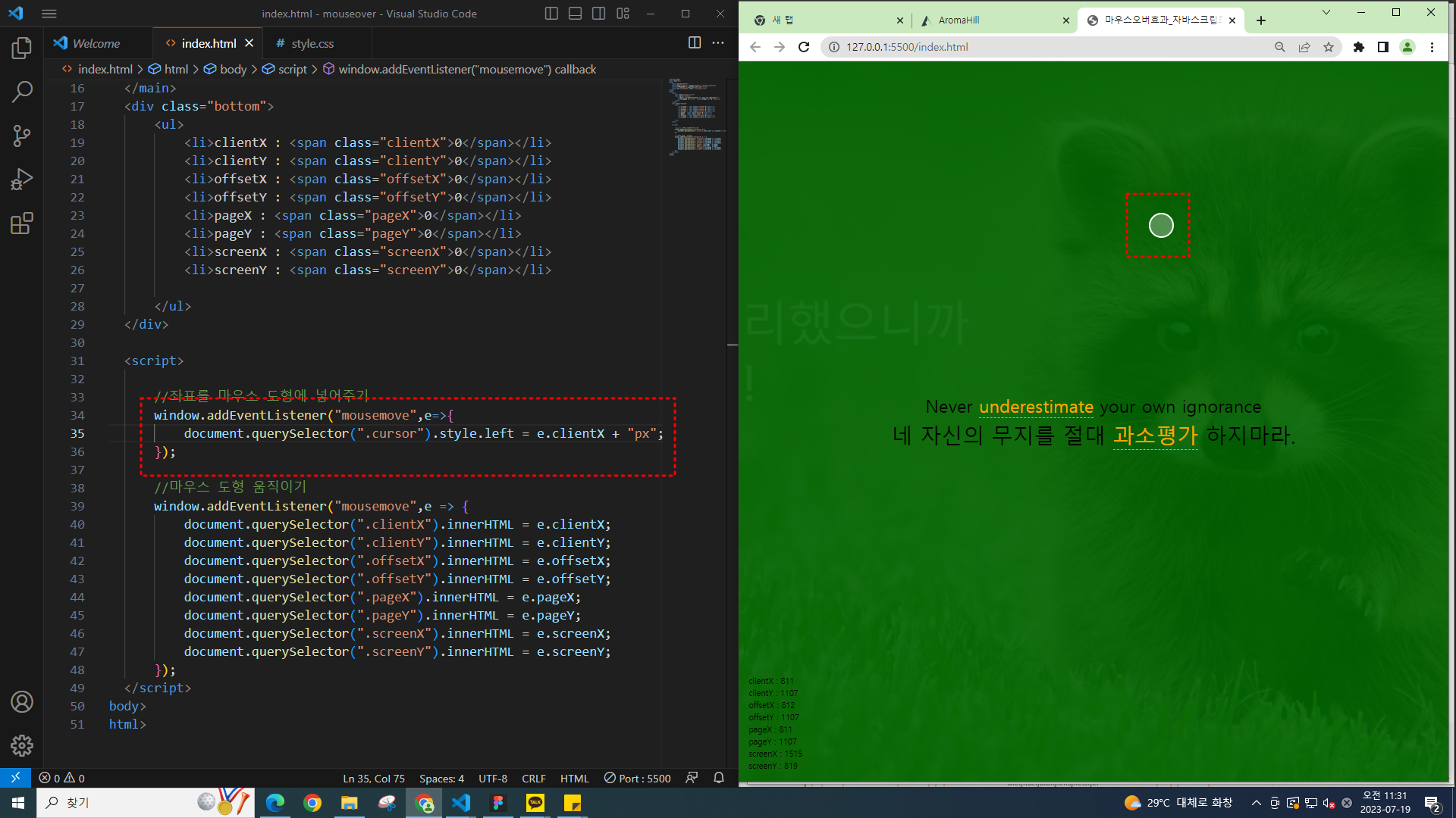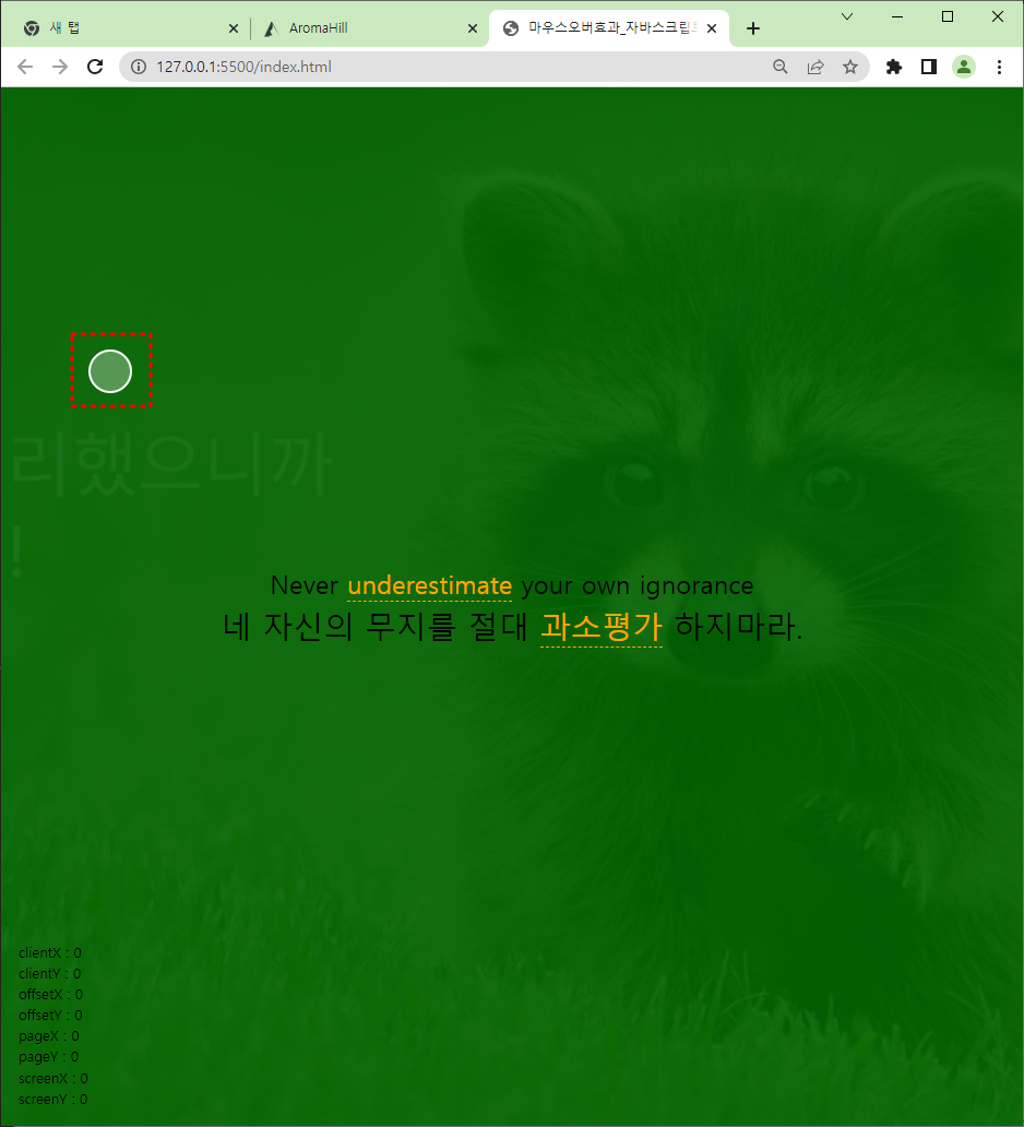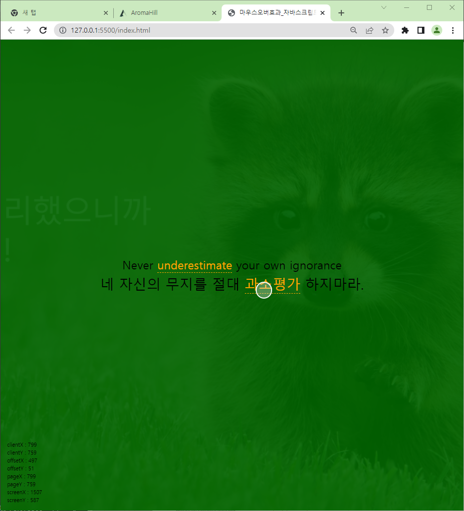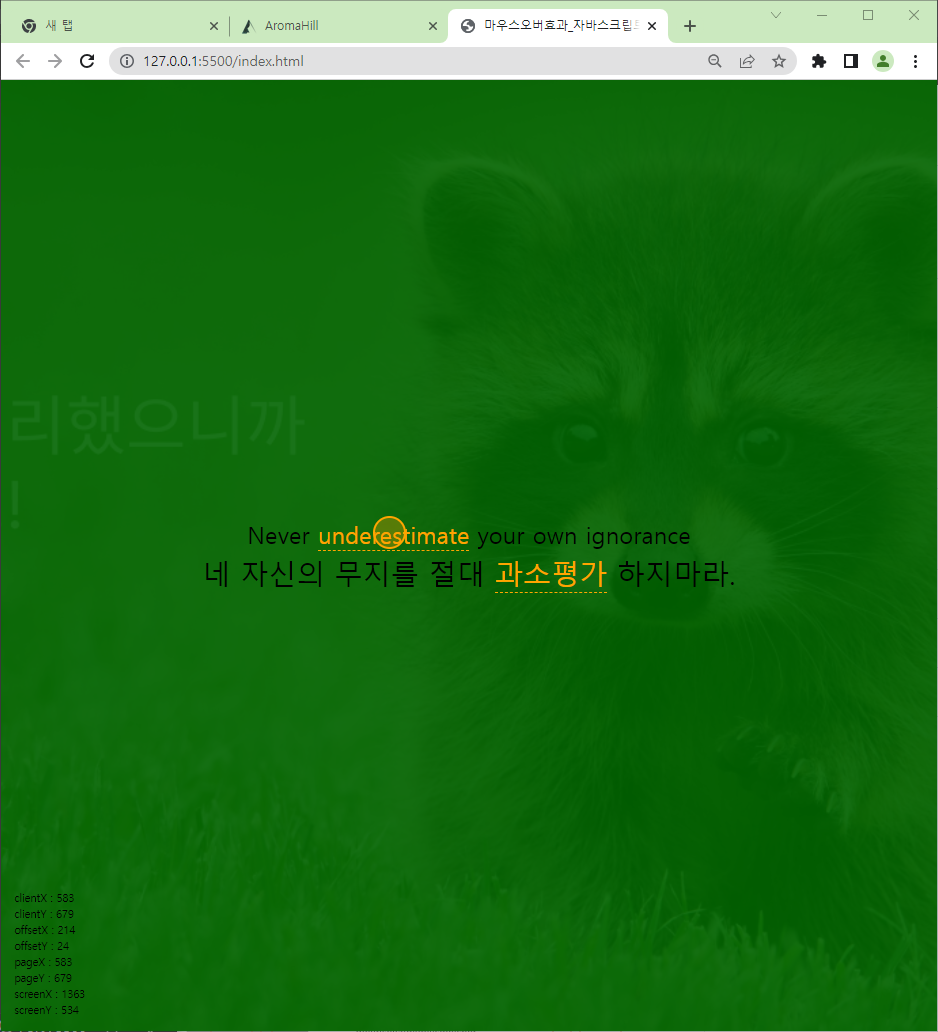 마우스를 움직이면 좌표값이 나오는 것을 콘솔에서 확인할 수 있다.