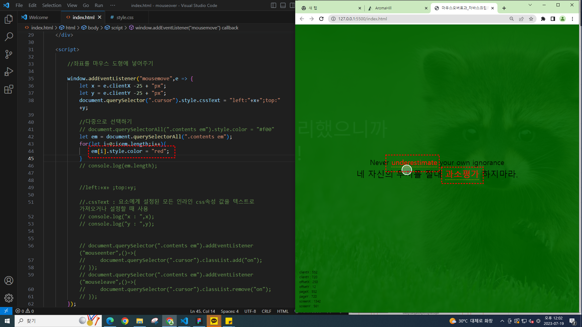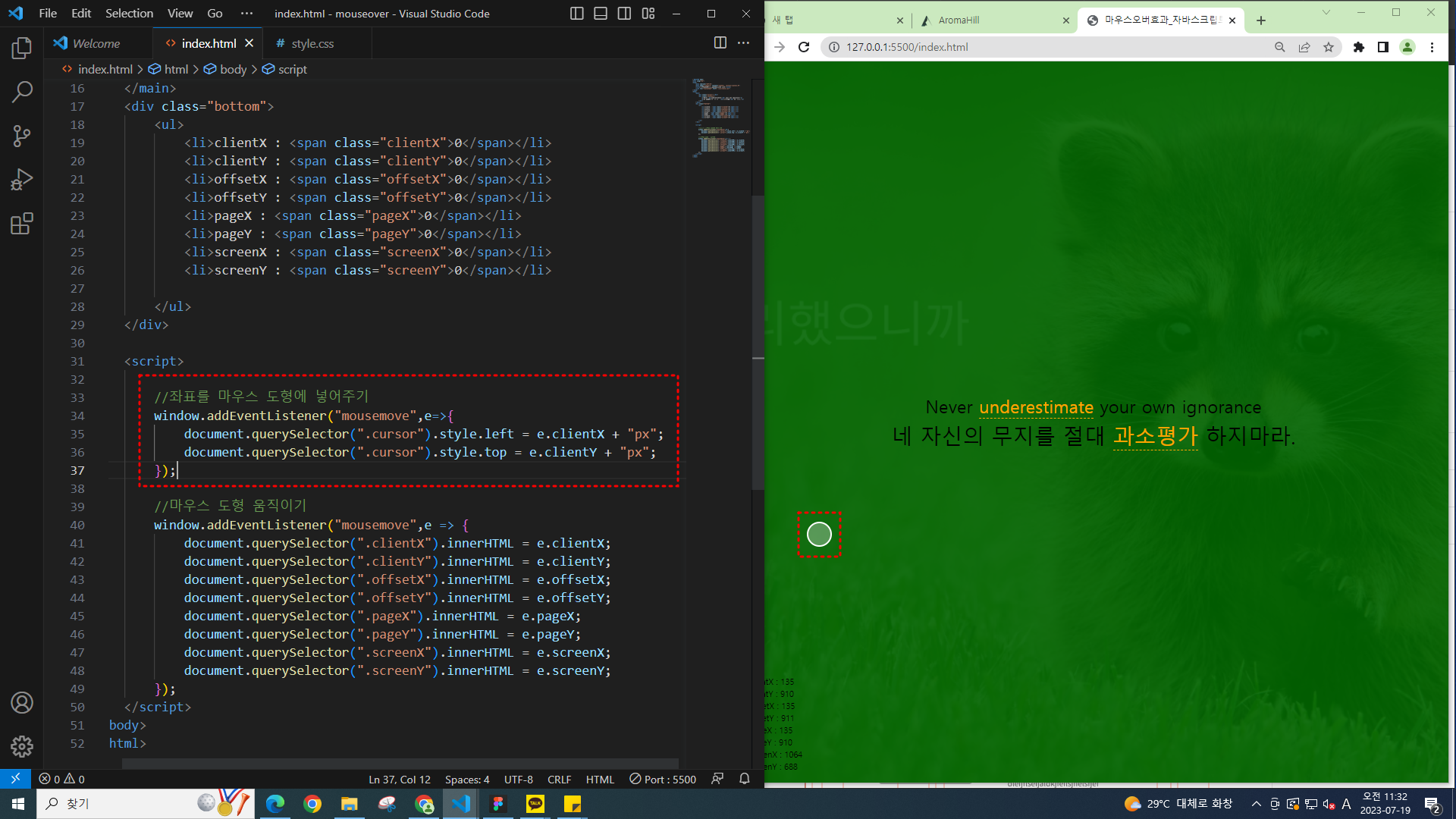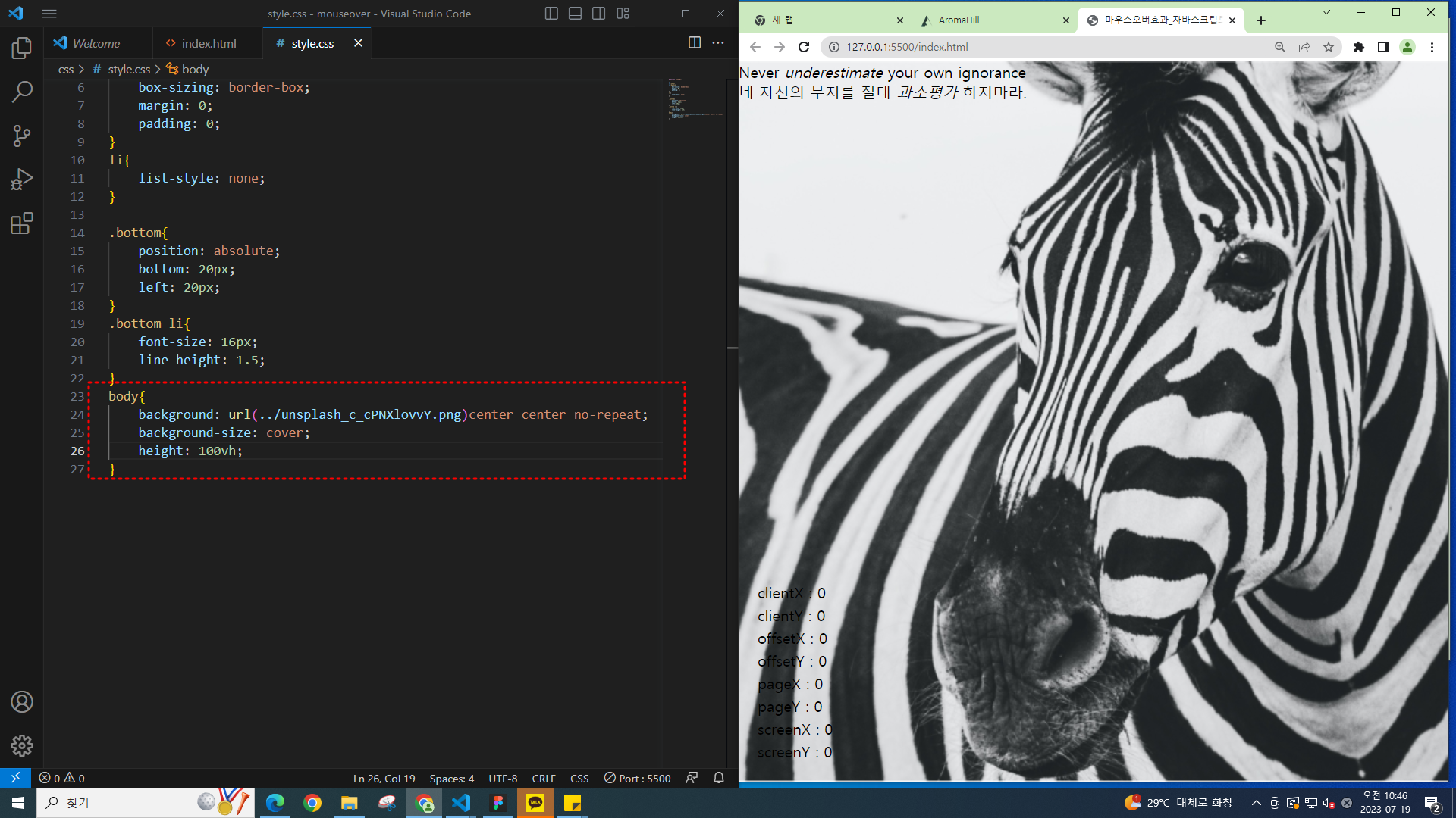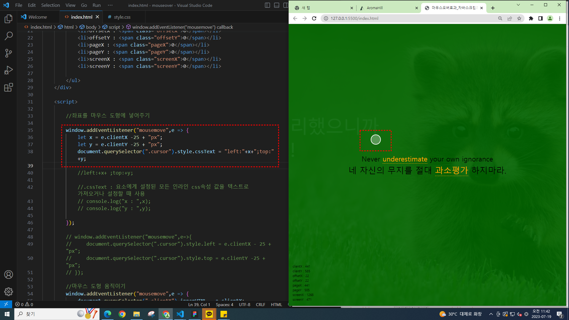 마우스를 움직이면 좌표값이 나오는 것을 콘솔에서 확인할 수 있다.
