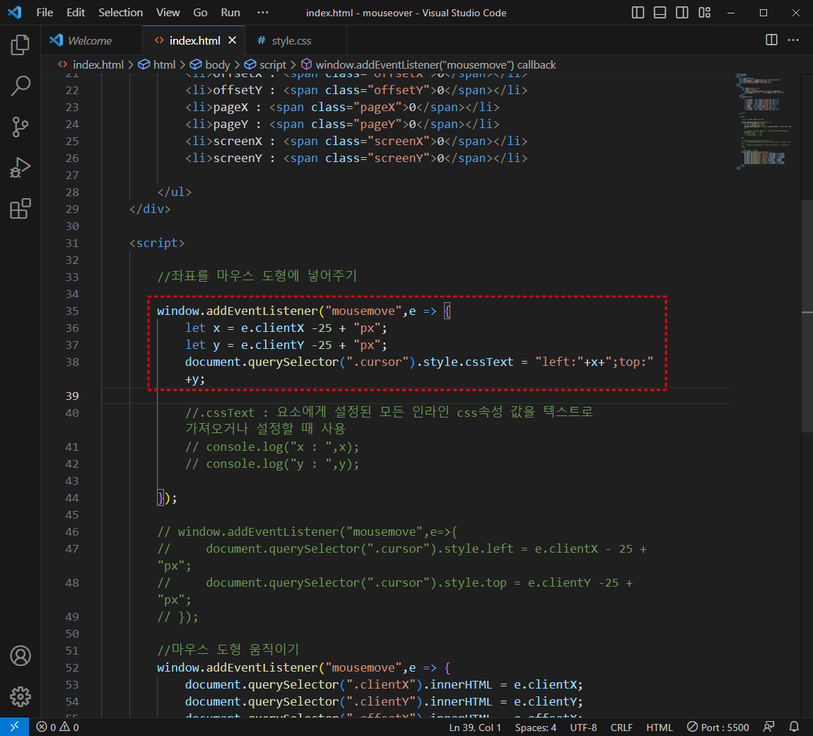 document.querySelector(".cursor").style.cssText = "left :"+x+";top :"+y;
