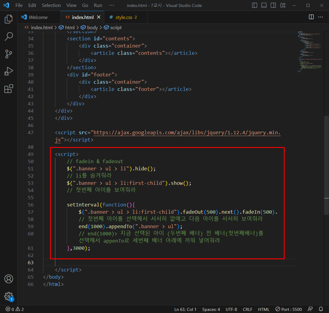 // end(1000)> 지금 선택된 아이 (두번째 배너) 전 배너(첫번째배너)를 선택해서 appenTo로 세번쨰 배너 아래에 끼워 넣어줘라