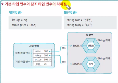 기본타입 변수는 실제 값을 변수 안에 저장하지만, 참조타입 변수는 메모리의 번지를 변수 안에 저장, 번지(주소값)을 통해 객체를 참조