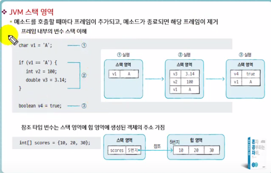 스택 영역은 int, long, boolean 등 기본 자료형을 생성할 때 저장하는 공간으로, 임시적으로 사용되는 변수나 정보들이 저장되는 영역