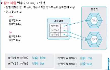 참조 타입 변수의 값은 힙 영역의 객체 주소이므로 ==, != 연산은 결국 번지값을 비교하는 것