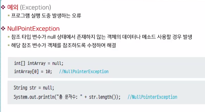 만약 null상태에서 있지도 않은 객체의 데이터(필드) 나 메소드르 사용하는 코드를 실행하면 NullPointException이 발생한다.