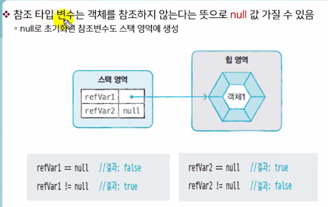 참조 타입 변수는 힙영역의 객체를 참조하지 않는다는 뜻으로 null 값을 가질 수 있다.