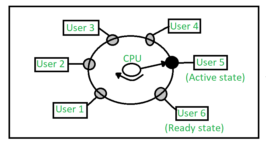 - 좋은 응답 시간(response time)을 제공하기 위해 각 사용자들에게 CPU 시간(Time slice, quantum)만큼을 차례로 할당하는 라운드 로빈(round robin) 스케줄링을 사용