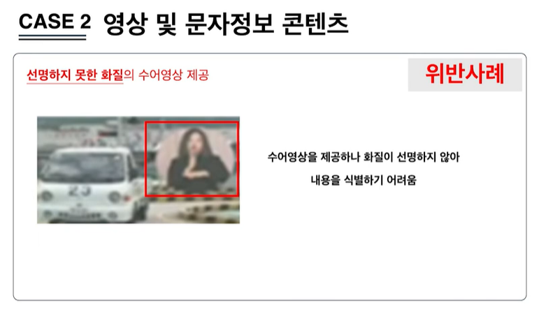 1. 장애인이 멀티미디어 콘텐츠를 비장애인과 동등하게 인식할 수 있도록 자막, 대본 또는 수어를 제공해야하며 멀티미디어