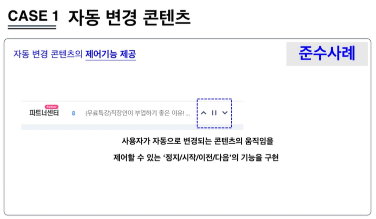 1. 배너와 같이 빠르게 변화하는 콘텐츠를 이용하기 어려운 지체 장애인, 노인, 뇌병변 장애인들도 빠르게 변화하는 콘텐츠를 이용할 수 있다.