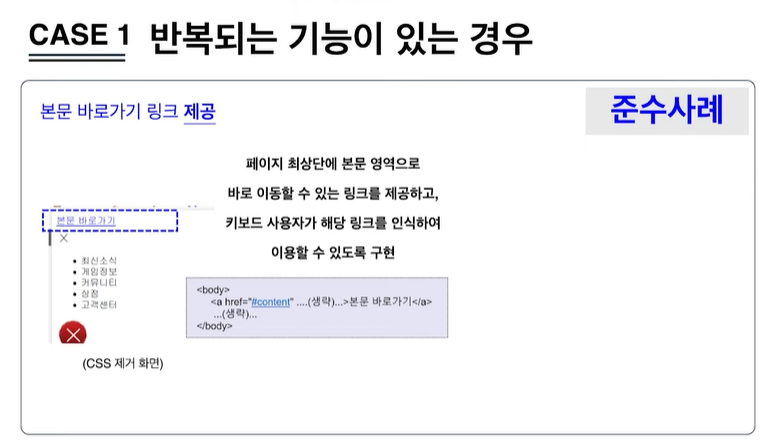 1. 사용자가 메뉴 등과 같은 반복 영역을 바로 건너뛰어 핵심 영역으로 직접 이동할 수 있는 수단을 제공해야 한다.