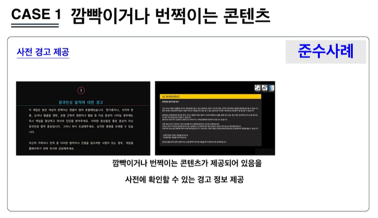 1. 광과민성 증후가 있는 사용자들은 빛이 번쩍거리는 것에 민감하게 반응하여 발작을 일으킬 수 있으나, 이 항목을 준수한 콘텐츠는 광과민성 증후가 있는 사용자의 접근이 가능하다.