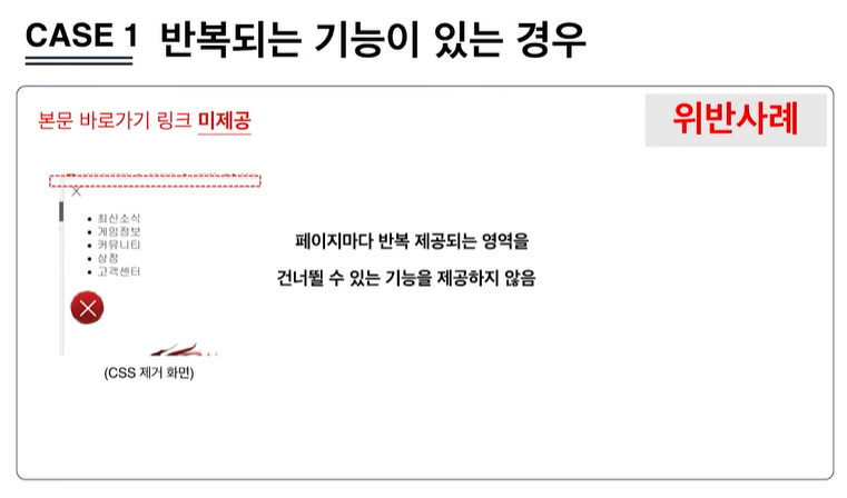 콘텐츠의 반복되는 영역은 건너뛸 수 있어야 한다.