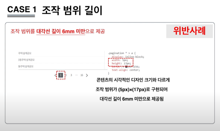 ⓣ 컨트롤의 크기 : 콘텐츠에 포함 모든 컨트롤은 대각선 방햐의 길이를 6.0mm 이상으로 제공하는 것이 바람직하다.