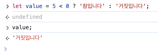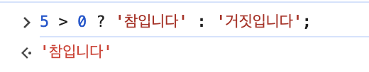 5 > 0은 true 이므로 '참입니다'가 결과값으로 출력된다.