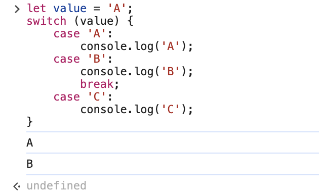 switch문은 case를 발견하면 일치여부와 상관없이 그 아래 case 들의 동작문을 모두 실행한다.