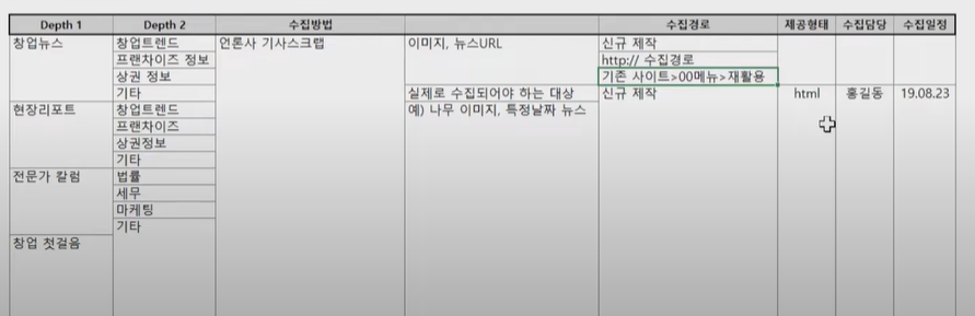 어떻게? 메뉴별로 수집방법, 수집대상, 수집경로, 제공형태, 수집담당자, 수집일정을 정리한다.