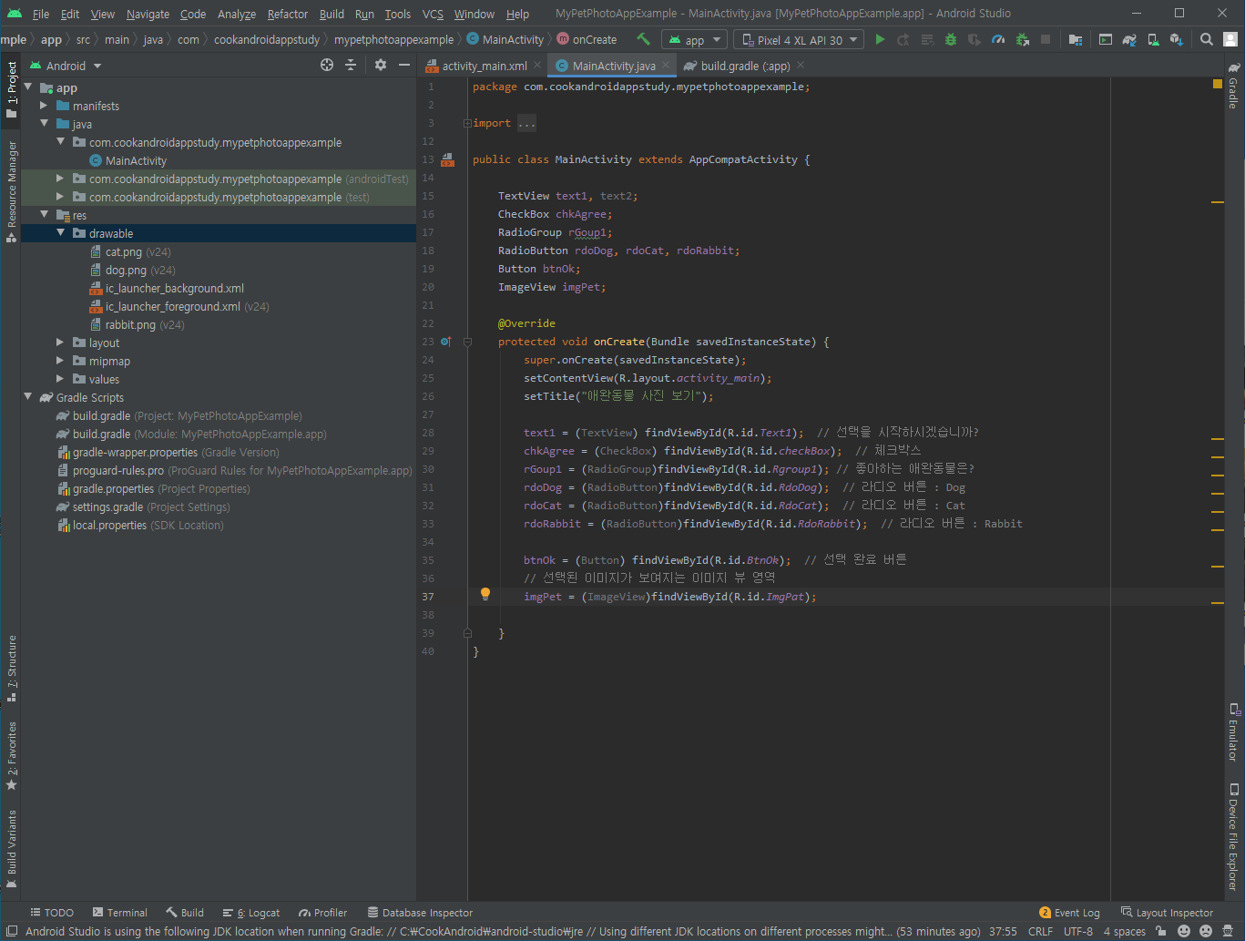 rdoDog = (RadioButton)findViewById(R.id.RdoDog); // 라디오버튼 : Dog