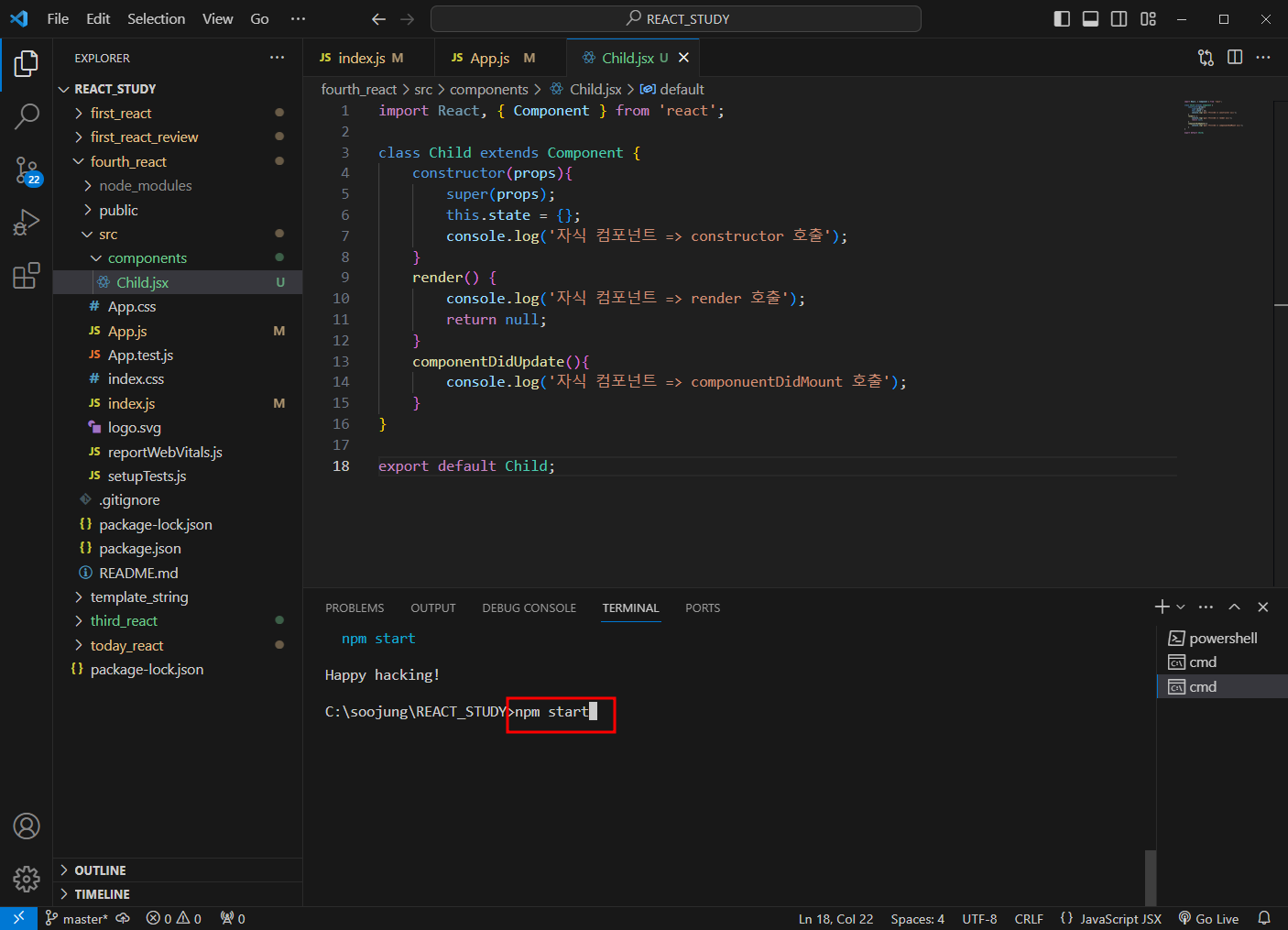 단계에서 메서드들이 실행되는 순서를 살펴보겠습니다. 부모컴포넌트와 자식컴포넌트를 하나씩 만들어서