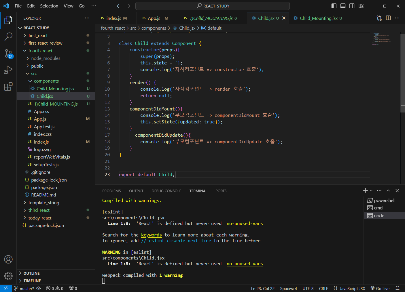 // 자식컴포넌트 => componentDidMount 두번 호출,