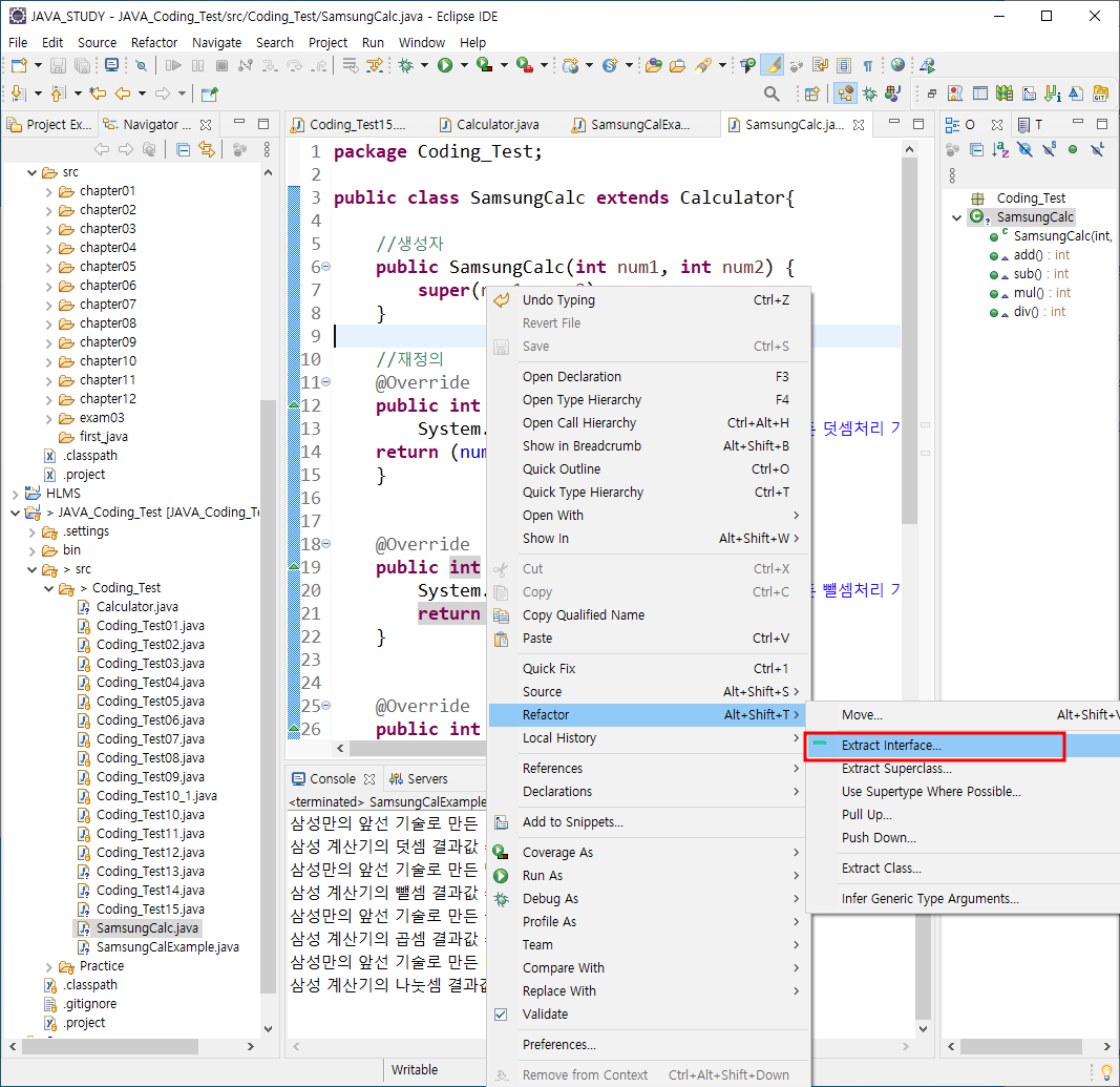 Calculator 로 하고, 실행 클래스(Class)명은 Coding_Test15로 하시기 바라며,