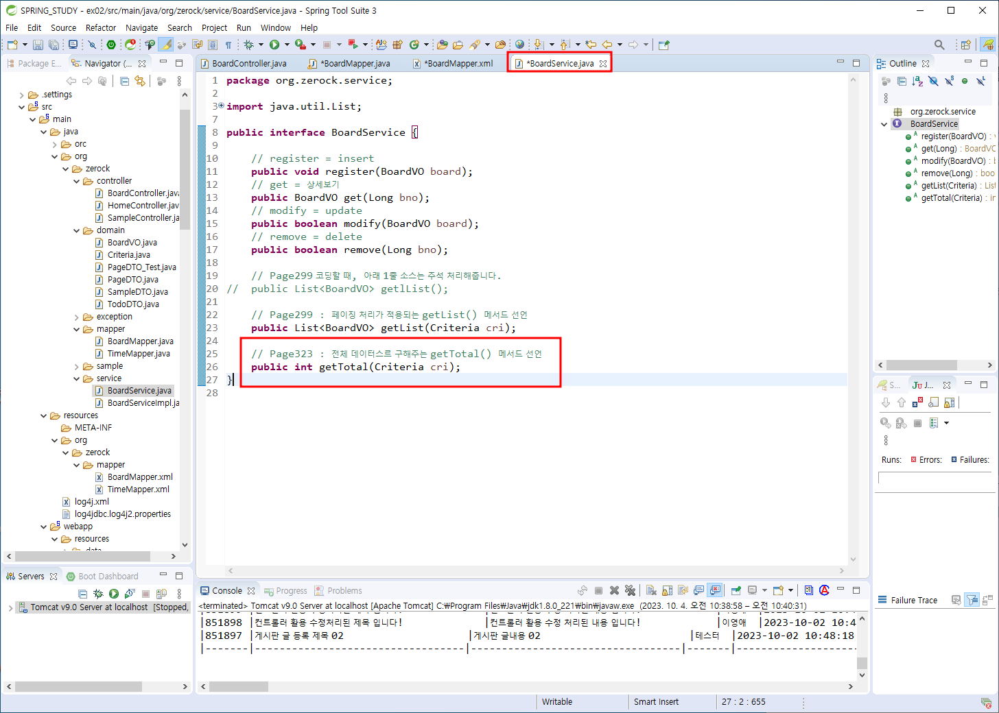 보드서비스에서 기능이 추가되었기 떄문에 보드서비스 구현 클래스에서 기능 추가하라고 에러가 뜬다.