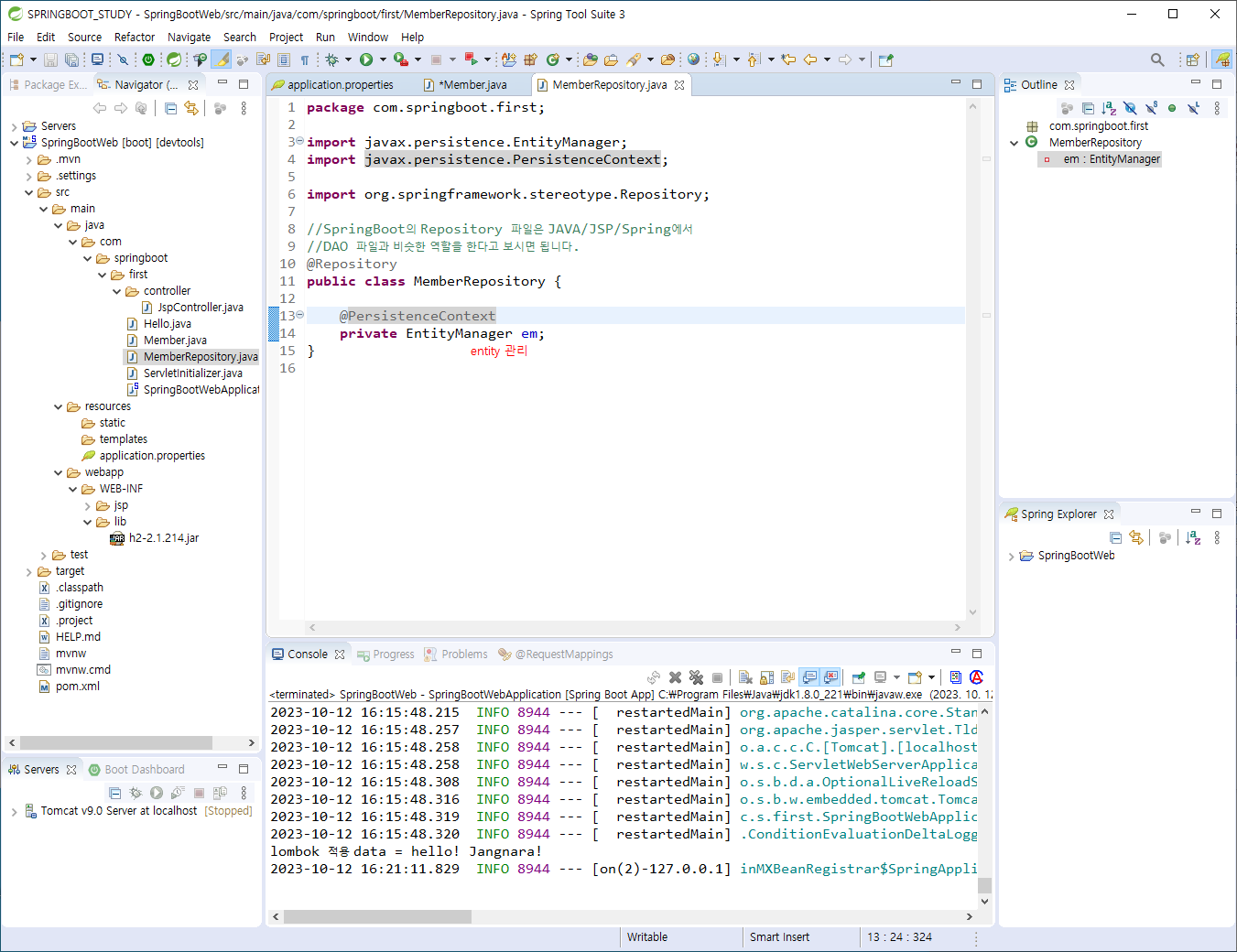 2) STS(또는 이클립스)의 Navigator 익스플로러 기준 MemberRepository.java 클릭 선택 - 우클릭