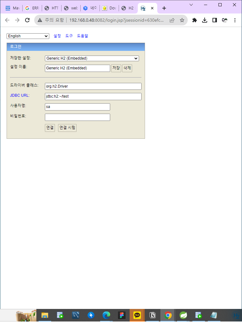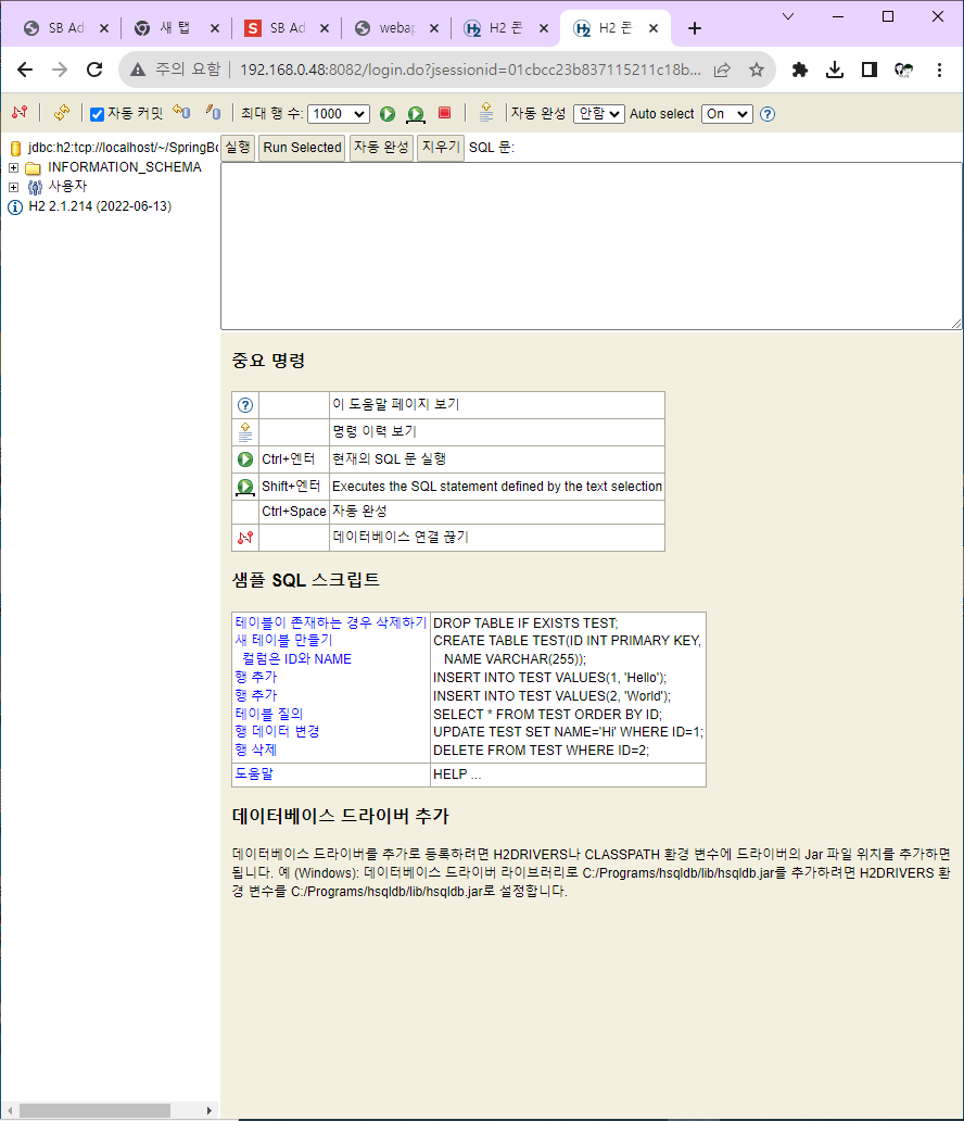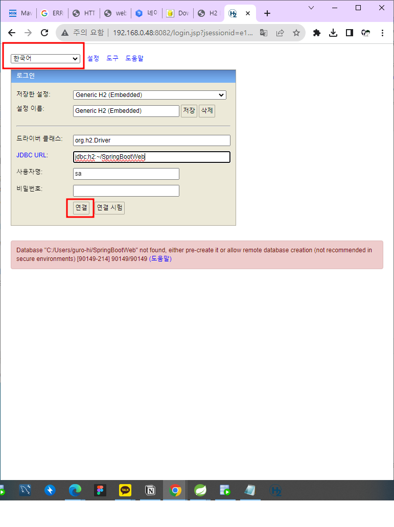 2) Chrome 웹 브라우저 연결 확인(h2 DB 기본 포트는 8082 입니다)