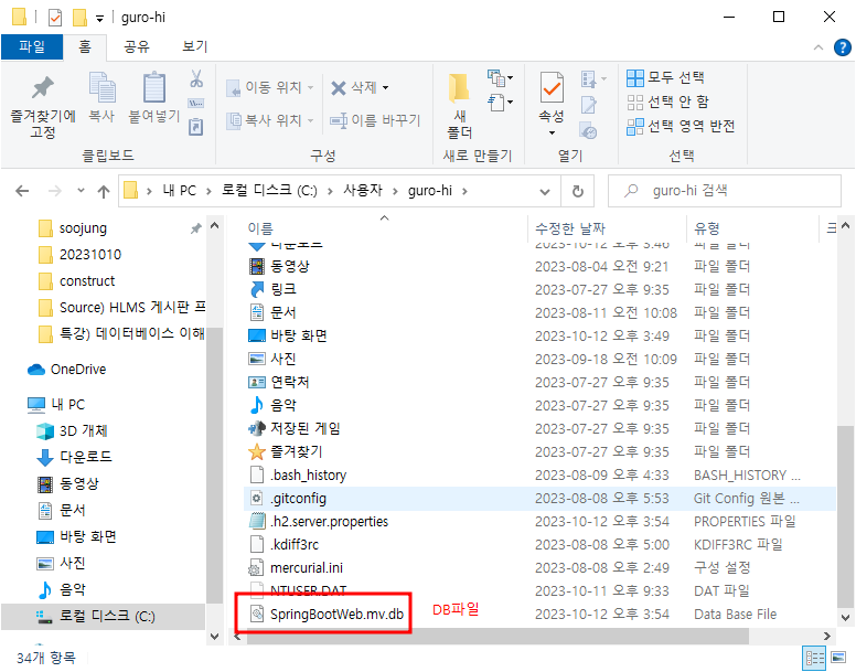 (참고로, 만약에 C드라이브에 SpringBootWeb 폴더에 SpringBootWeb.mv.db 파일을 생성하거나