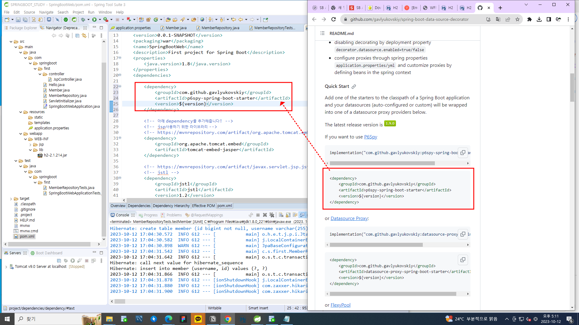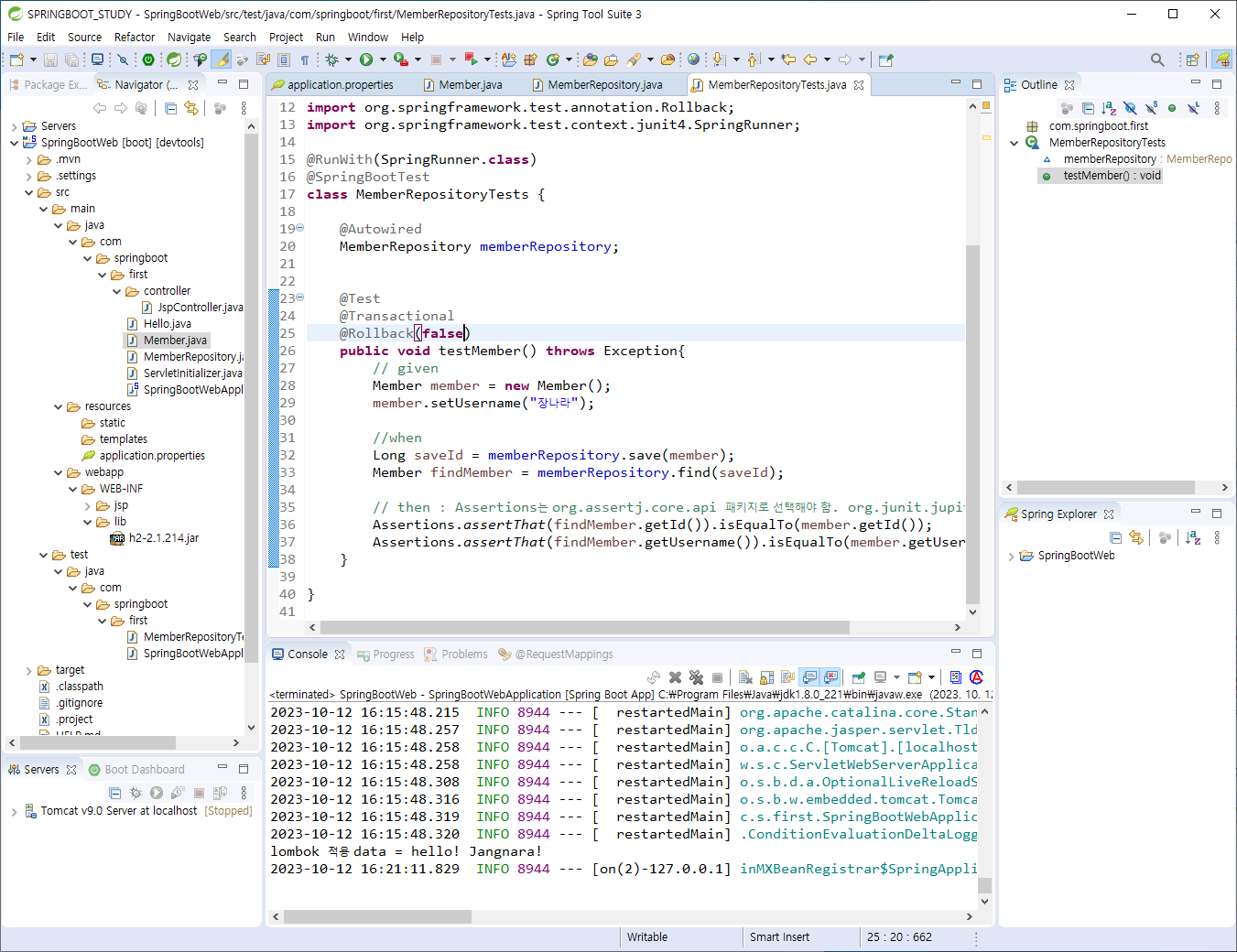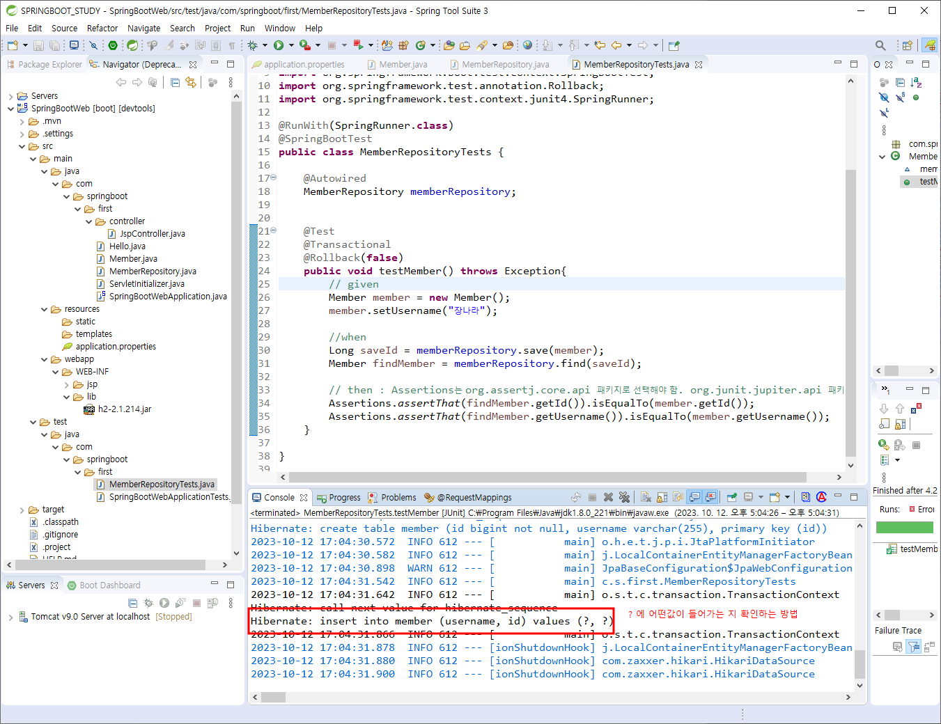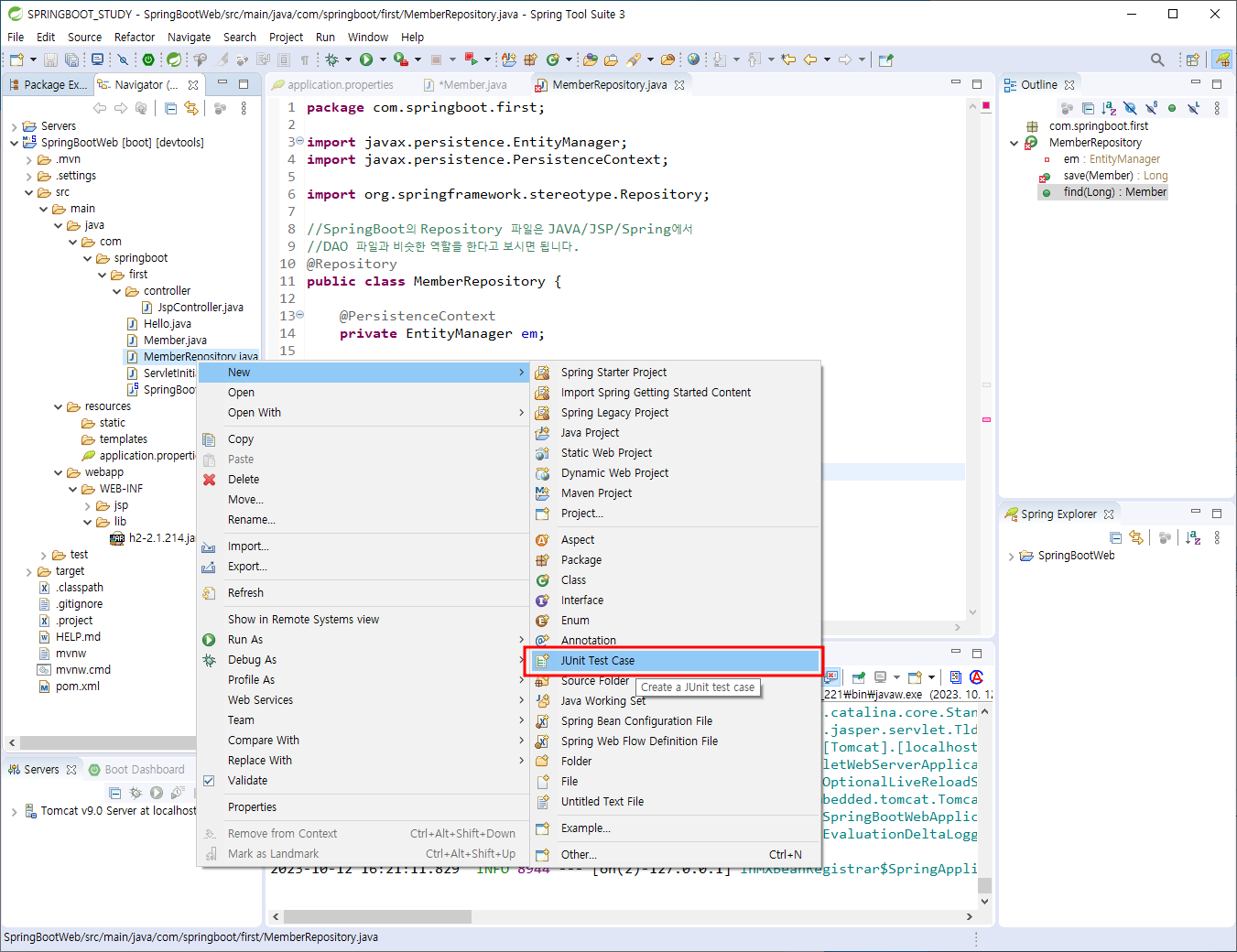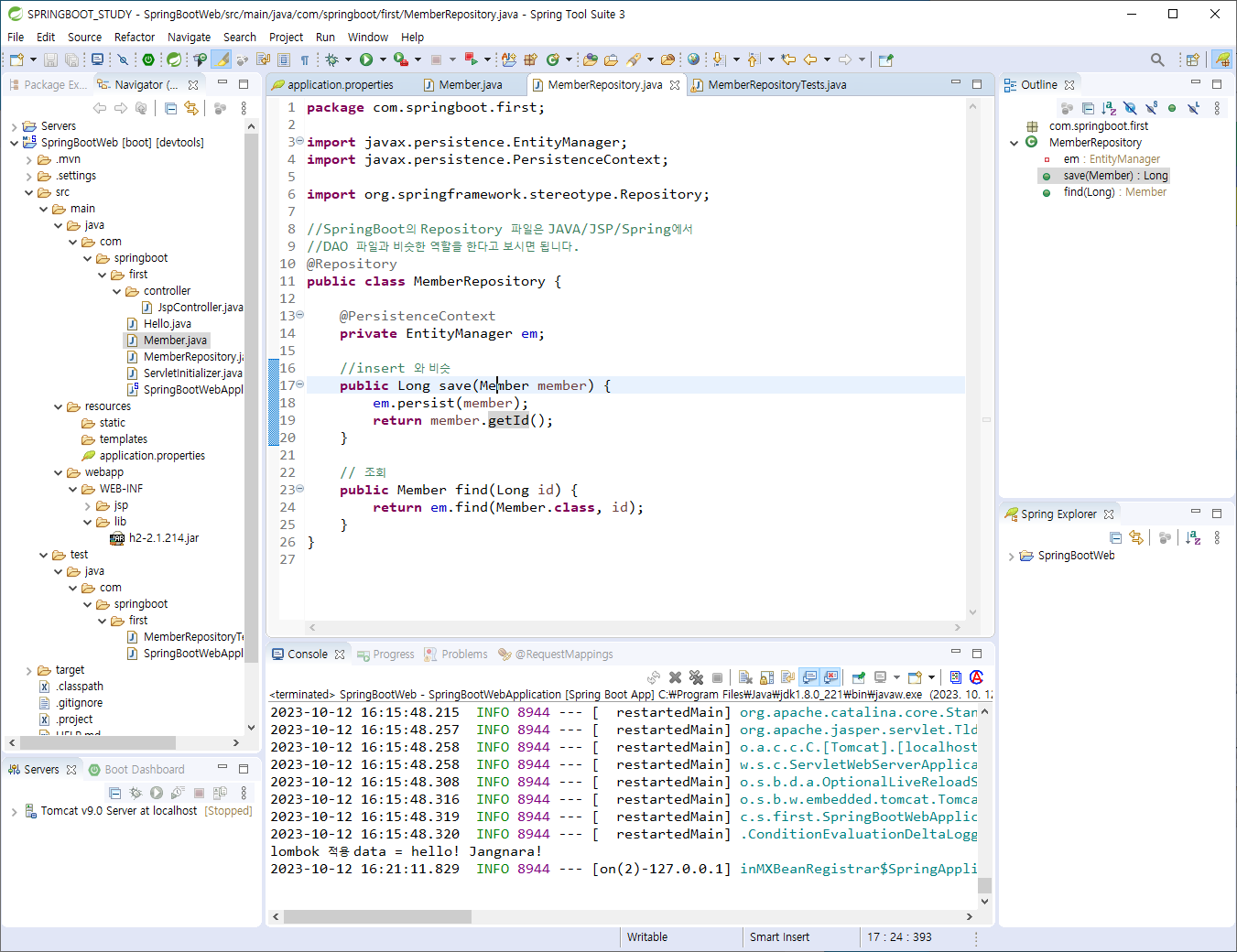 2) STS(또는 이클립스)의 Navigator 익스플로러 기준 MemberRepository.java 클릭 선택 - 우클릭