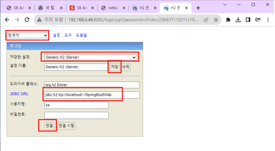 JDBC URL: 경로를 jdbc:h2:tcp://localhost/C:/SpringBootWeb/SpringBootWeb 이라고 해주면 됩니다)
