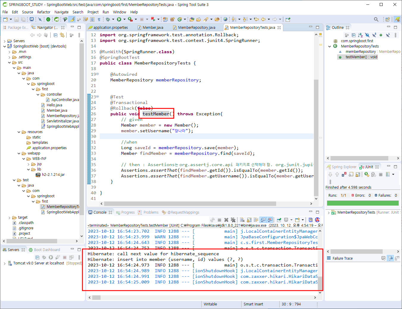 4) MemberRepositoryTest.java 파일 - 우클릭 - Run As - JUnit Test 클릭 - 우측 하단 JUnit 탭 확인
