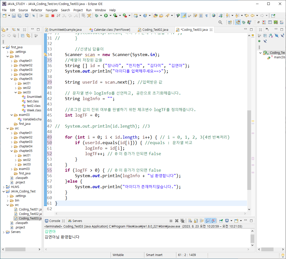 if (userId.equals(id[i])) { //equals : 문자열 비교