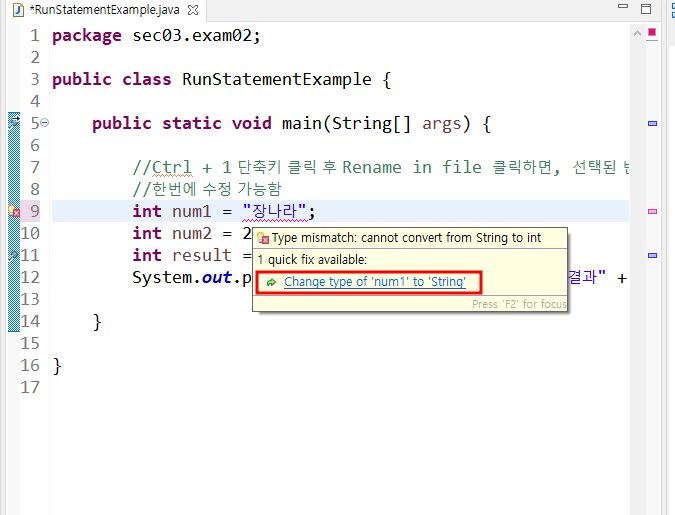 타입에 맞는 변수(문자열: String)를 추천해준다.