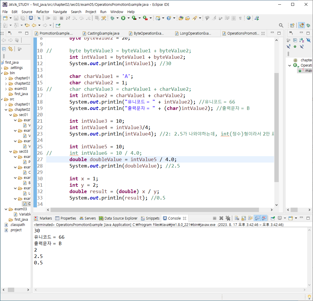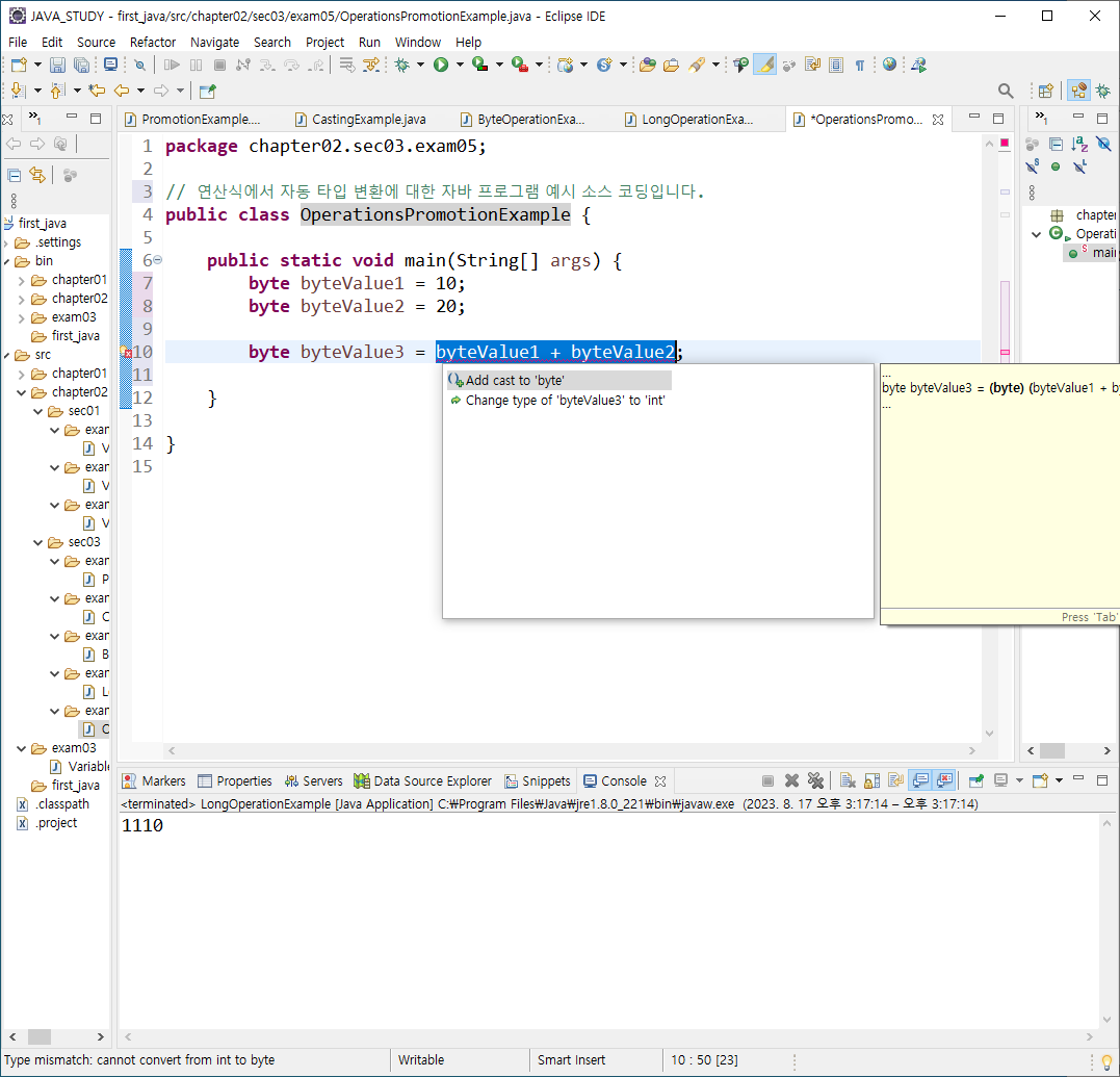 // 연산식에서 자동 타입 변환에 대한 자바 프로그램 예시 소스 코딩입니다.