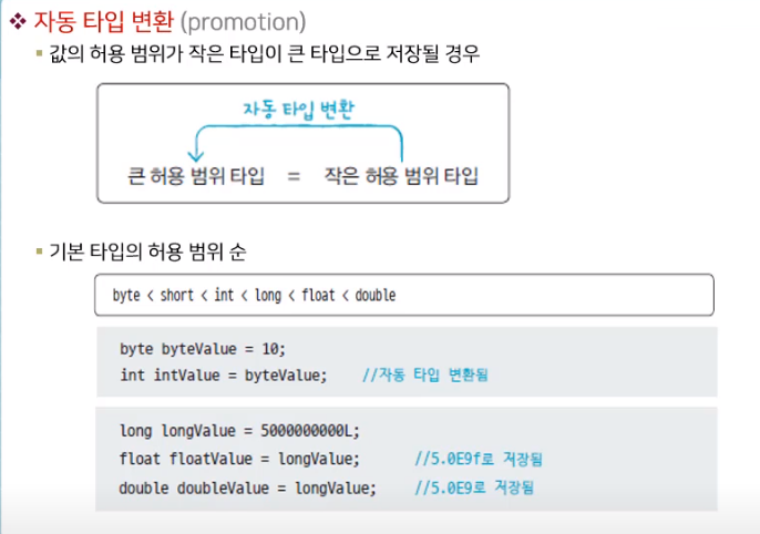 자동타입 변환은 값의 허용 범위가 작은 타입이 허용 범위가 큰 타입으로 저장될때 발생