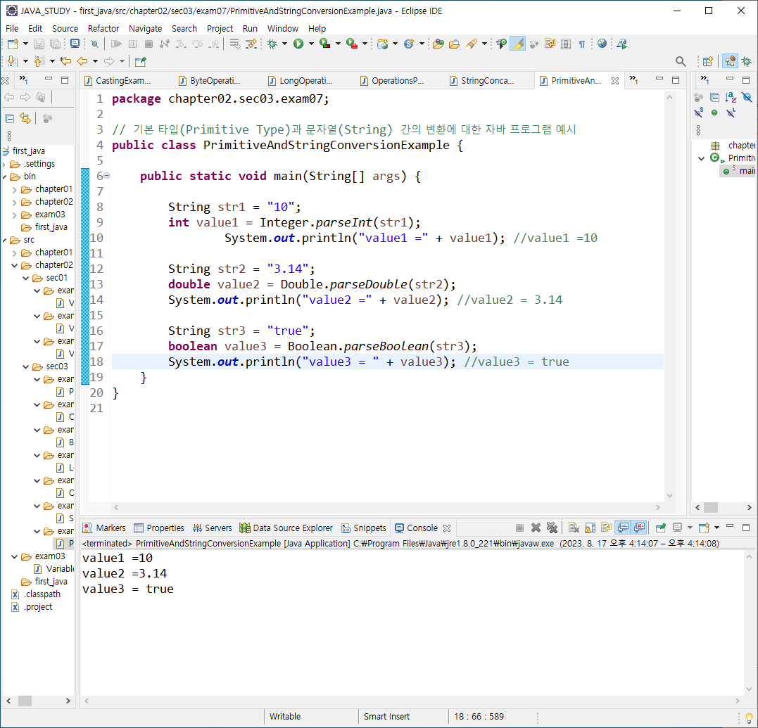// 기본 타입(Primitive Type)과 문자열(String) 간의 변환에 대한 자바 프로그램 예시