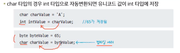 ③  char 타입 : int타입으로 자동 타입 변환되면 유니코드 값이 int타입에 저장된다.