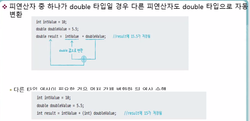 두 피연산자 중 허용범위가 큰 타입으로 변환되어 연산을 수행한다.